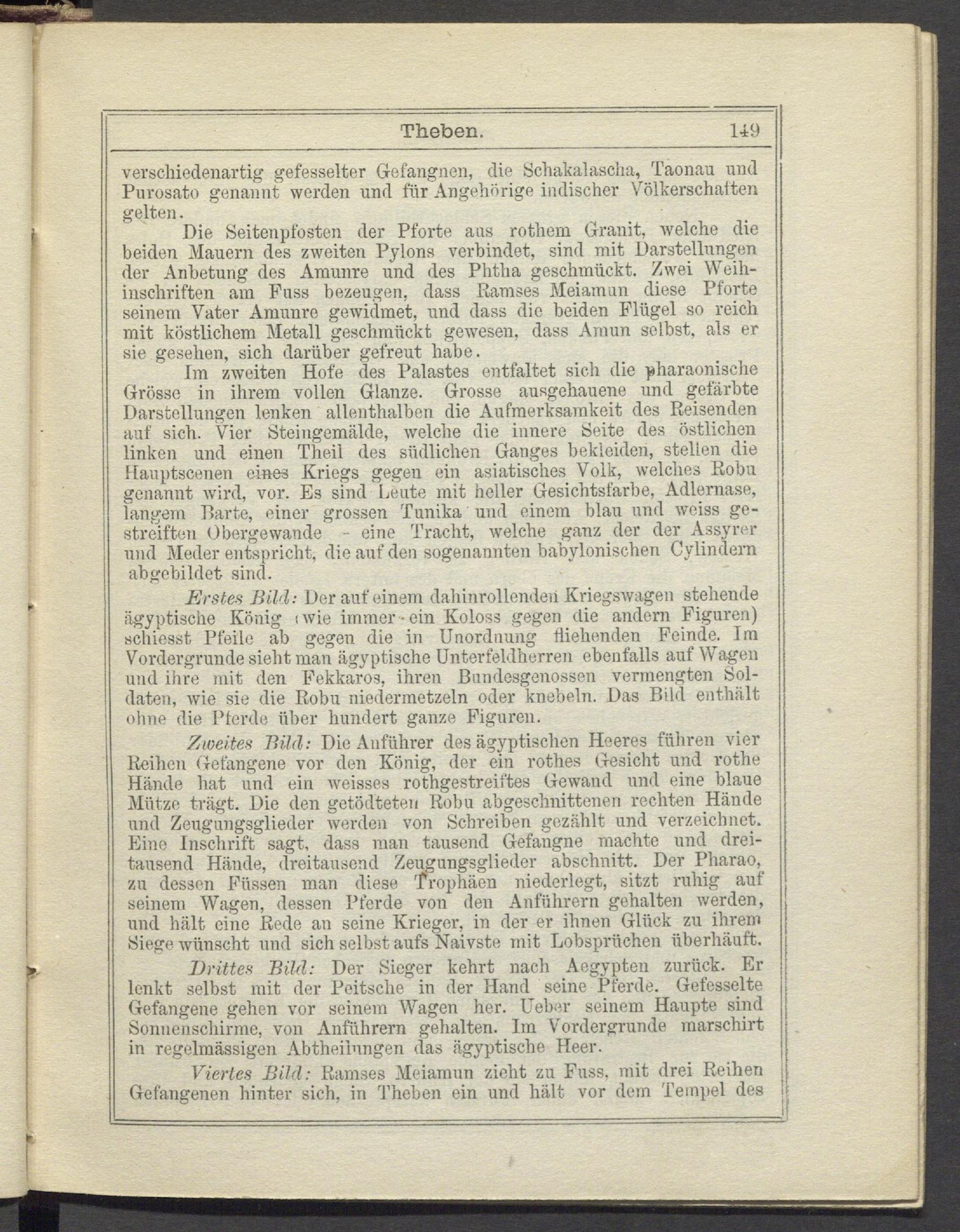 Im zweiten Hofe des Palastes entfaltet sich die pharaonische Grösse in ihrem vollen Glanze. Grosse ausgehauene und gefärbte Darstellungen lenken allenthalben die Aufmerksamkeit des Reisenden auf sich. Vier Steingemälde, welche die innere Seite des östlichen linken und einen Theil des südlichen Ganges bekleiden, stellen die Hanptscenen eines Kriegs gegen ein asiatisches Volk, welches Robu genannt wird, vor. Es sind Leute mit heller Gesichtsfarbe, Adlernase, langem Harte, einer grossen Tunika' und einem blau und weiss gestreiften Obergewamle - eine Tracht, welche ganz der der Assyrer und Meder entspricht, die auf den sogenannten babylonischen Cylindem abgobildet sind.