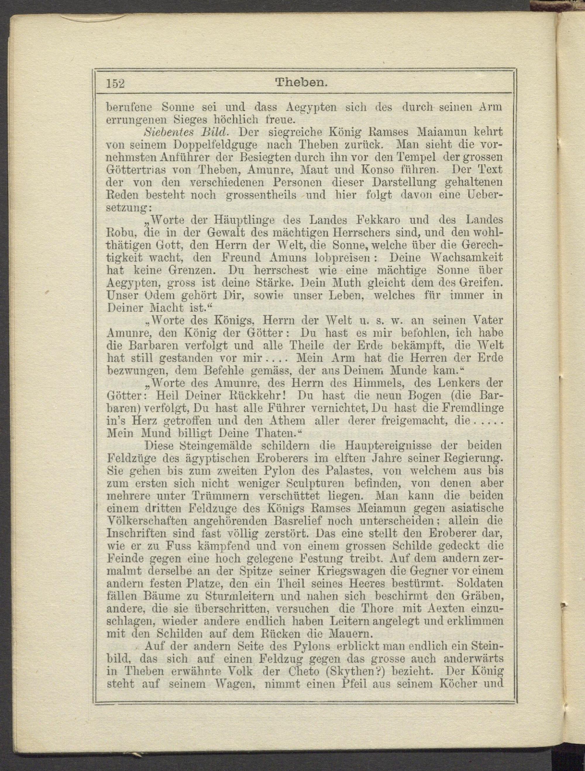 „Worte des Königs, Herrn der Welt u. s. w. an seinen Vater Amunre, den König der Götter: Du hast es mir befohlen, ich habe die Barbaren verfolgt und alle Theile der Erde bekämpft, die Welt hat still gestanden vor mir.... Mein Arm hat die Herren der Erde bezwungen, dem Befehle gemäss, der aus Deinem Munde kam.' 1
