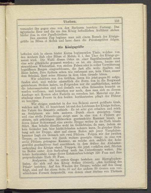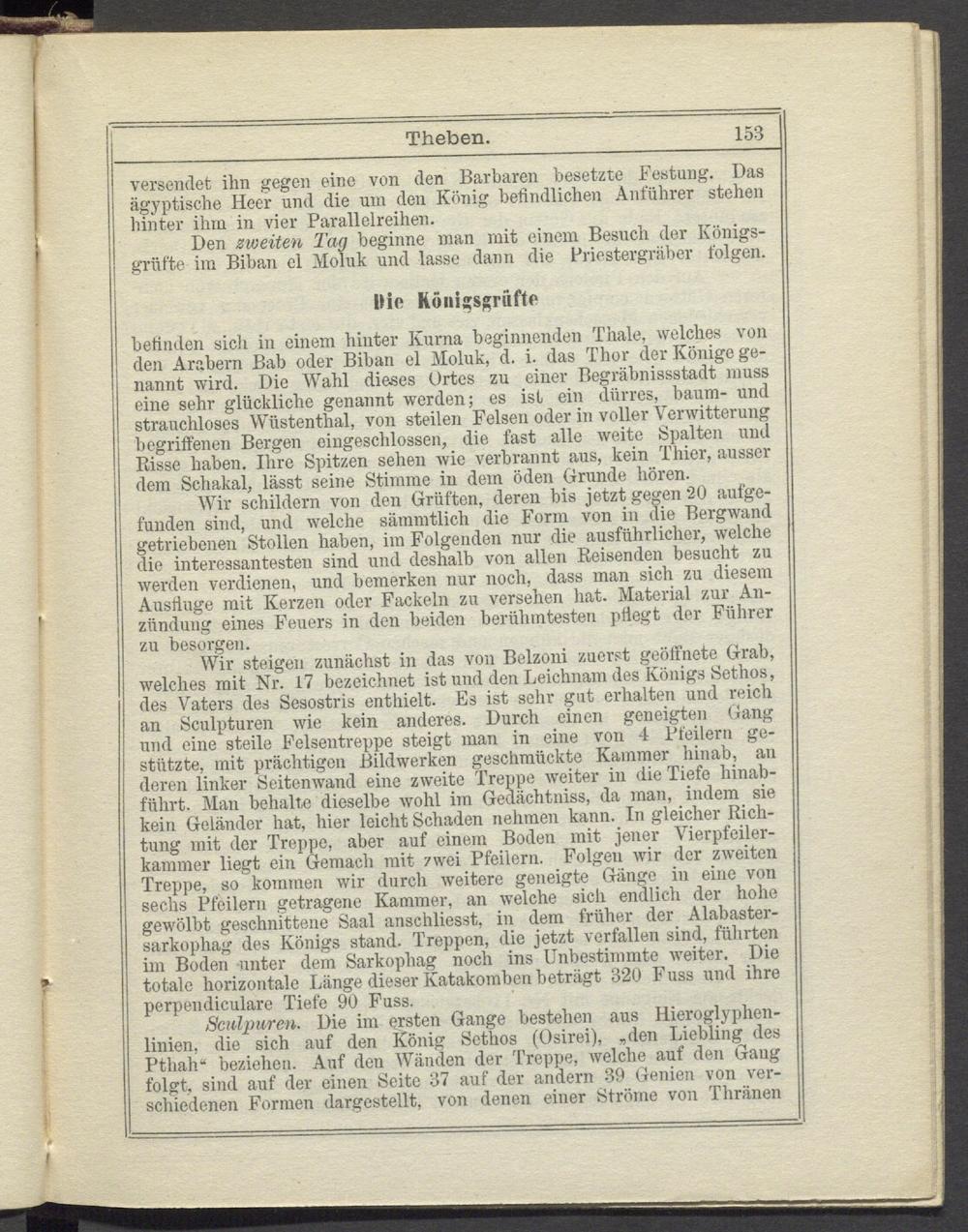 Wir steigen zunächst in das von Belzoni zuerst geöffnete Grab, welches mit Nr. 17 bezeichnet ist und den Leichnam des Königs Sethos, des Vaters des Sesostris enthielt. Es ist sehr gut erhalten und reich an Sculpturen wie kein anderes. Durch einen geneigten Gang und eine steile Felsentreppe steigt man in eine von 4 Pfeilern gestützte, mit prächtigen Bildwerken geschmückte Kammer hinab, an deren linker Seitenwand eine zweite Treppe weiter in die Tiefe hinah- fiihrt. Man behalte dieselbe wohl im Gedächtniss, da man, indem sie kein Geländer hat, hier leicht Schaden nehmen kann. In gleicher Dichtung mit der Treppe, aber auf einem Boden mit jener Vierpfeilerkammer liegt ein Gemach mit zwei Pfeilern. Folgen wir der zweiten Treppe, so kommen wir durch weitere geneigte Gänge in eine von sechs Pfeilern getragene Kammer, an welche sich endlich der hohe gewölbt geschnittene Saal anschliesst, in dem früher der Alabastersarkophag des Königs stand. Treppen, die jetzt verfallen sind, führten im Boden unter dem Sarkophag noch ins Unbestimmte weiter. Die totale horizontale Länge dieser Katakomben beträgt 320 F uss und ihre perpendiculare Tiefe 90 Fnss.