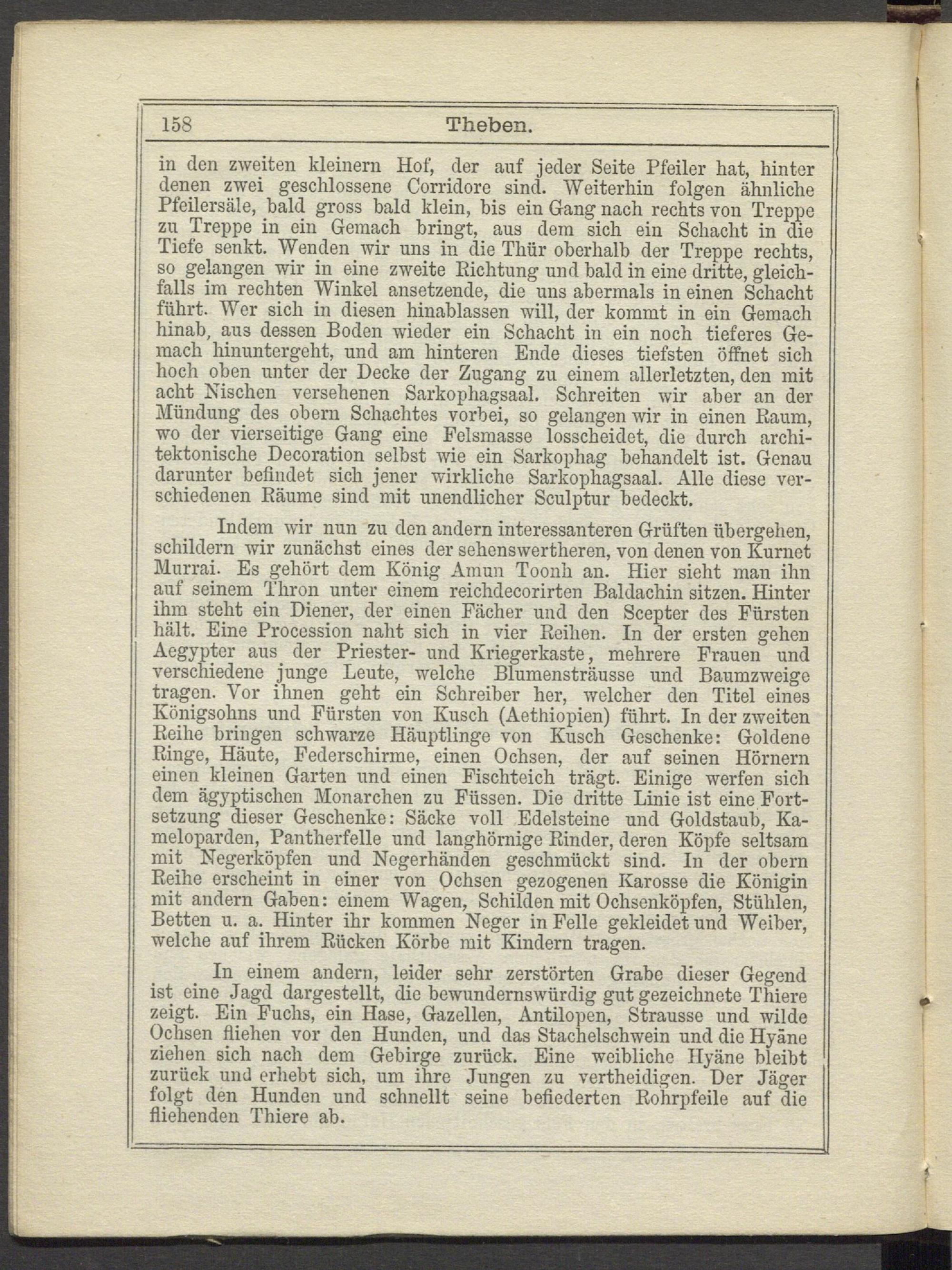 In einem andern, leider sehr zerstörten Grabe dieser Gegend ist eine Jagd dargestellt, die bewundernswürdig gut gezeichnete Thiere zeigt. Ein Fuchs, ein Hase, Gazellen, Antilopen, Strausse und wilde Ochsen fliehen vor den Hunden, und das Stachelschwein und die Hyäne ziehen sich nach dem Gebirge zurück. Eine weibliche Hyäne bleibt zurück und erhebt sich, um ihre Jungen zu vertheidigen. Der Jäger folgt den Hunden und schnellt seine befiederten Rohrpfeile auf die fliehenden Thiere ab.