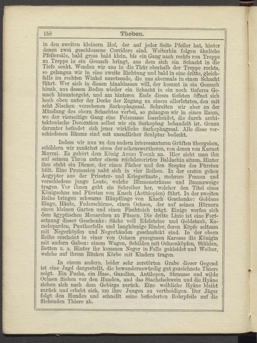 Indem wir nun zu den andern interessanteren Grüften übergehen, schildern wir zunächst eines der sehenswertheren, von denen von Kurnet Murrai. Es gehört dem König Amun Toonh an. Hier sieht man ihn auf seinem Thron unter einem reichdecorirten Baldachin sitzen. Hinter ihm steht ein Diener, der einen Fächer und den Scepter des Fürsten hält. Eine Procession naht sich in vier Reihen. In der ersten gehen Aegyptor aus. der Priester- und Kriegerkaste, mehrere Frauen und verschiedene junge Leute, welche Blumensträusse und Baumzweige tragen. Vor ihnen geht ein Schreiber her, welcher den Titel eines Königsohns und Fürsten von Kusch (Aethiopien) führt. In der zweiten Reihe bringen schwarze Häuptlinge von Kusch Geschenke: Goldene Ringe, Häute, Federschirme, einen Ochsen, der auf seinen Hörnern einen kleinen Garten und einen Fischteich trägt. Einige werfen sich dem ägyptischen Monarchen zu Füssen. Die dritte Linie ist eine Fortsetzung dieser Geschenke: Säcke voll Edelsteine und Goldstaub, Ka- meloparden, Pantherfelle und langhörnige Rinder, deren Köpfe seltsam mit Negerköpfen und Negerhänden geschmückt sind. In der obern Reihe erscheint in einer von Ochsen gezogenen Karosse die Königin mit andern Gaben: einem Wagen, Schilden mit Ochsenköpfen, Stühlen, Betten u. a. Hinter ihr kommen Neger in Felle gekleidet und Weiber, welche auf ihrem Rücken Körbe mit Kindern tragen.