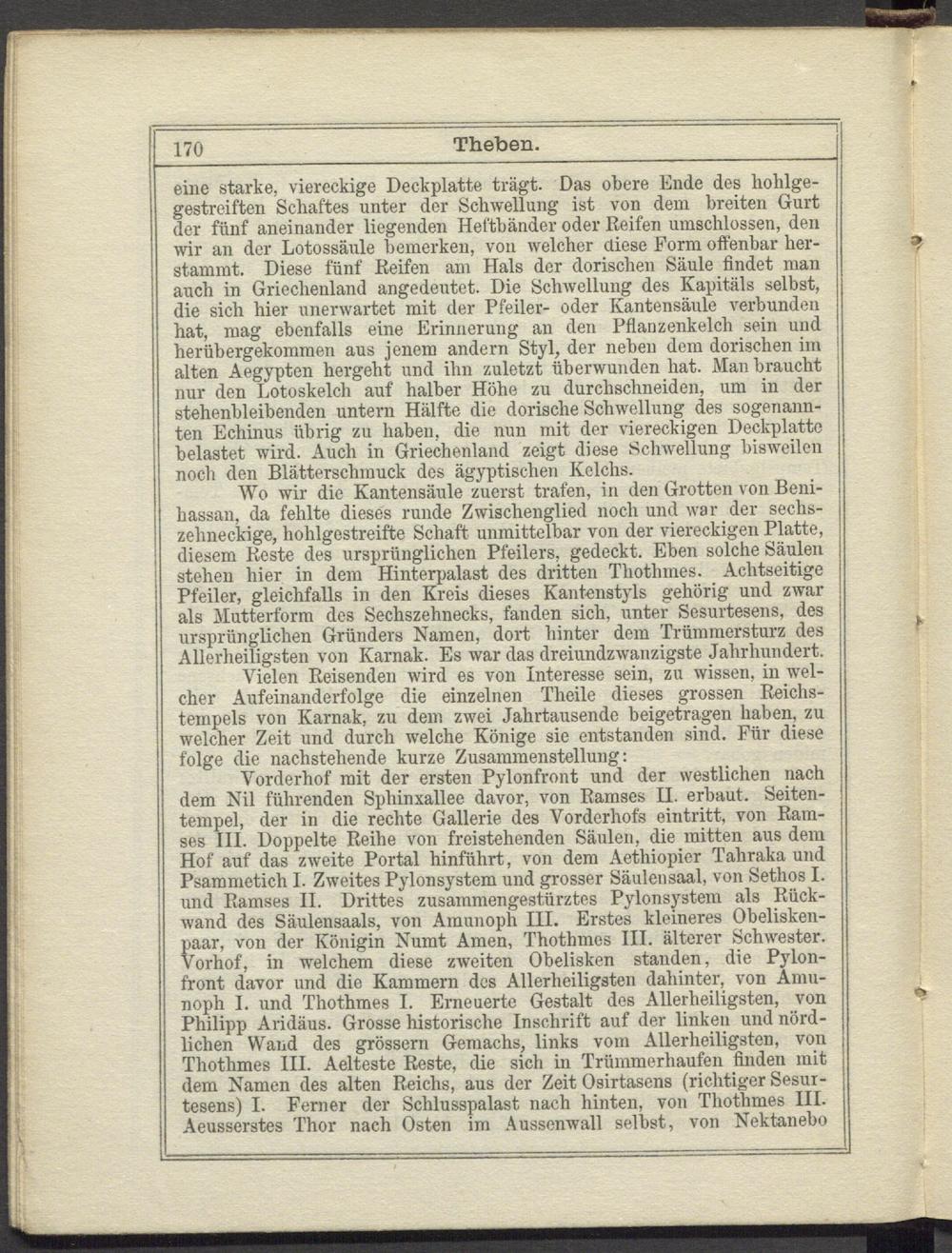Vielen Reisenden wird es von Interesse sein, zu wissen, in welcher Aufeinanderfolge die einzelnen Theile dieses grossen Reichstempels von Karnak, zu dem zwei Jahrtausende beigetragen haben, zu welcher Zeit und durch welche Könige sie entstanden sind. Für diese folge die nachstehende kurze Zusammenstellung: