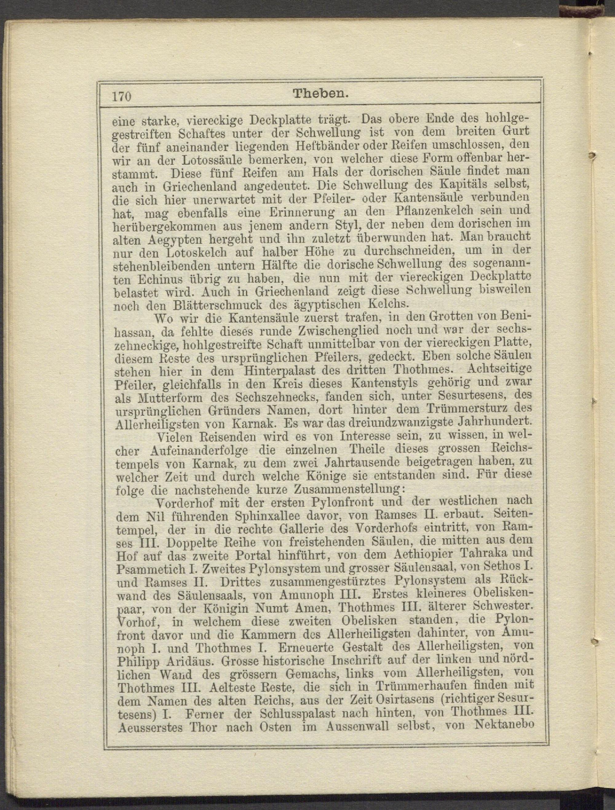 Wo wir die Kantensäule zuerst trafen, in den Grotten von Beni- hassan, da fehlte dieses runde Zwischenglied noch und war der sechszehneckige, hohlgestreifte Schaft unmittelbar von der viereckigen Platte, diesem Reste des ursprünglichen Pfeilers, gedeckt. Eben solche Säulen stehen hier in dem Hinterpalast des dritten Thothmes. Achtseitige Pfeiler, gleichfalls in den Kreis dieses Kanteustyls gehörig und zwar als Mutterform des Sechszehnecks, fanden sich, unter Sesurtesens, des ursprünglichen Gründers Namen, dort hinter dem Trümmersturz des Allerheiligsten von Karnak. Es war das dreiundzwanzigste Jahrhundert.