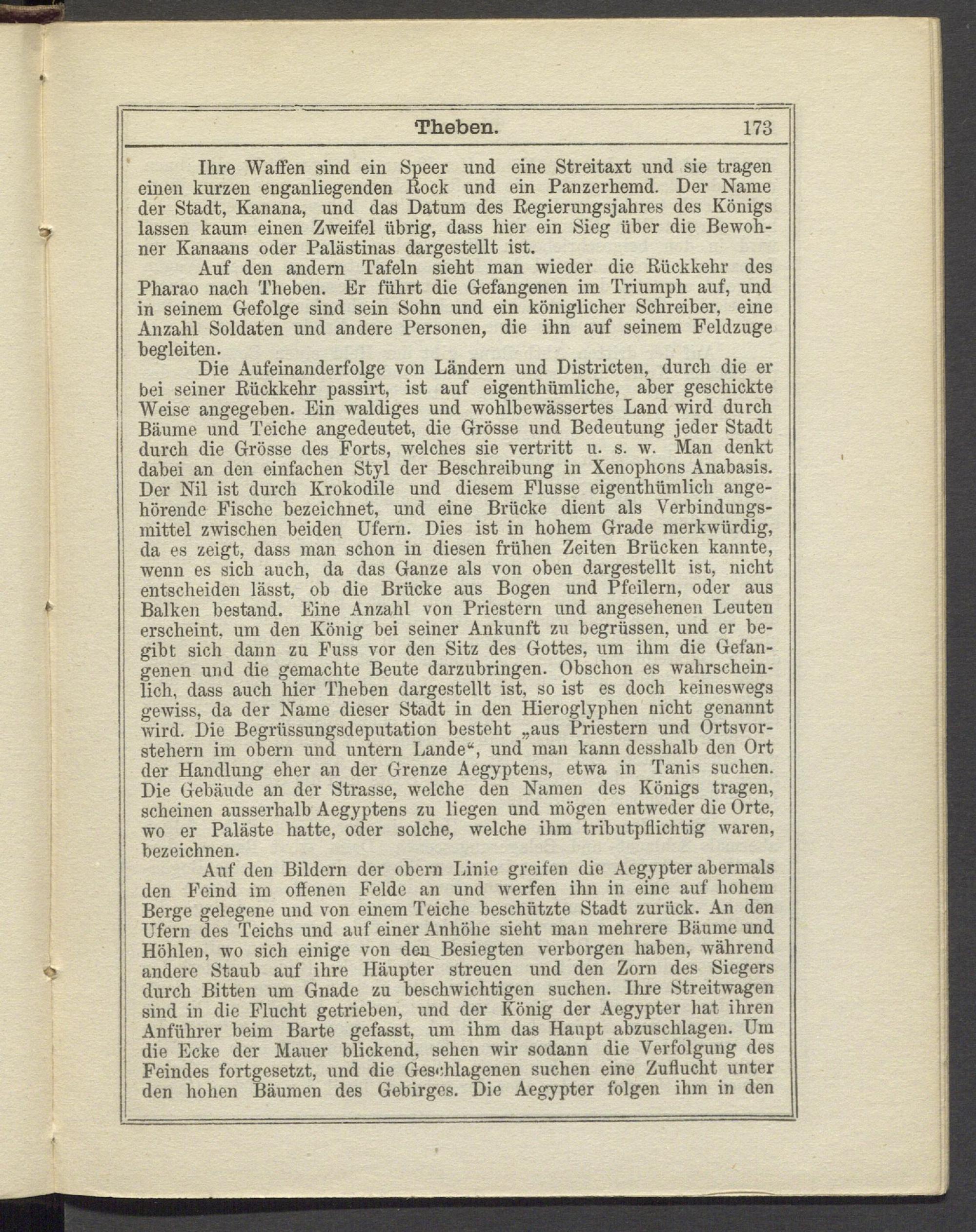 Die Aufeinanderfolge von Ländern und Districten, durch die er bei seiner Rückkehr passirt, ist auf eigentümliche, aber geschickte Weise angegeben. Ein waldiges und wohlbewässertes Land wird durch Bäume und Teiche angedeutet, die Grösse und Bedeutung jeder Stadt durch die Grösse des Forts, welches sie vertritt u. s. w. Man denkt dabei an den einfachen Styl der Beschreibung in Xenophons Anabasis. Der Nil ist durch Krokodile und diesem Flusse eigentümlich ange- hörendc Fische bezeichnet, und eine Brücke dient als Verbindungsmittel zwischen beiden Ufern. Dies ist in hohem Grade merkwürdig, da es zeigt, dass man schon in diesen frühen Zeiten Brücken kannte, wenn es sich auch, da das Ganze als von oben dargestellt ist, nicht entscheiden lässt, ob die Brücke aus Bogen und Pfeilern, oder aus Balken bestand. Eine Anzahl von Priestern und angesehenen Leuten erscheint, um den König bei seiner Ankunft zu begrüssen, und er begibt sich dann zu Fuss vor den Sitz des Gottes, um ihm die Gefangenen und die gemachte Beute darzubringen. Obschon es wahrscheinlich, dass auch hier Theben dargestellt ist, so ist es doch keineswegs gewiss, da der Name dieser Stadt in den Hieroglyphen nicht genannt wird. Die Begrüssungsdeputation besteht „aus Priestern und Ortsvor- stehern im obern und untern Lande“, und mau kann desshalb den Ort der Handlung eher an der Grenze Aegyptens, etwa in Tunis suchen. Die Gebäude an der Strasse, welche den Namen des Königs tragen, scheinen ausserhalb Aegyptens zu liegen und mögen entweder die Orte, wo er Paläste hatte, oder solche, welche ihm tributpflichtig waren, bezeichnen.