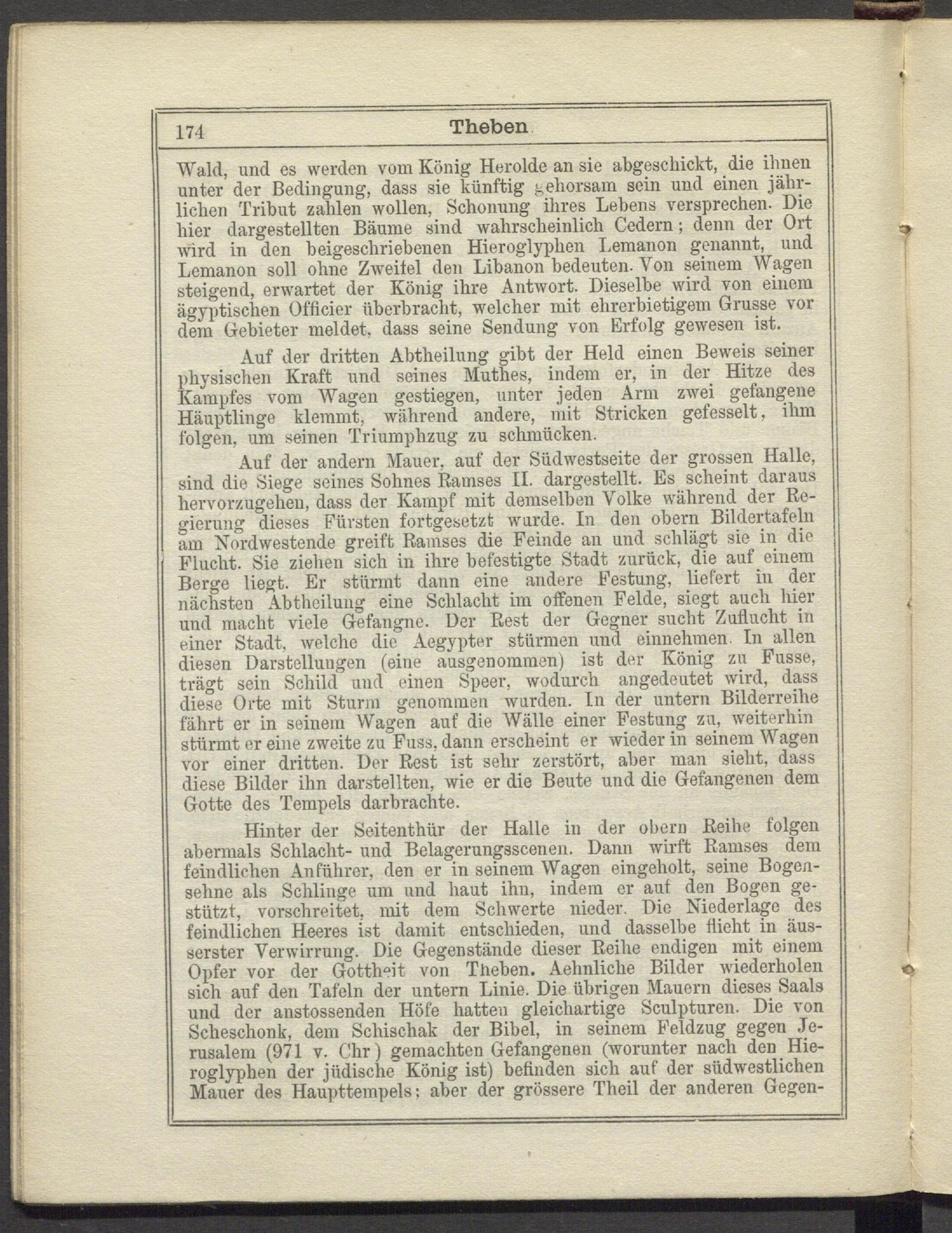 Hinter der Seitenthür der Halle in der obern Reihe folgen abermals Schlacht- und Belagerungsscenen. Dann wirft Ramses dem feindlichen Anführer, den er in seinem Wagen eingeholt, seine Bogensehne als Schlinge um und haut ihn, indem er auf den Bogen gestützt, vorschreitet, mit dem Schwerte nieder. Die Niederlage des feindlichen Heeres ist damit entschieden, und dasselbe flieht in äus- serster Verwirrung. Die Gegenstände dieser Reihe endigen mit einem Opfer vor der Gottheit von Theben. Aehnliche Bilder wiederholen sich auf den Tafeln der untern Linie. Die übrigen Mauern dieses Saals und der anstossenden Höfe hatten gleichartige Sculpturen. Die von Scheschonk, dem Schischak der Bibel, in seinem Feldzug gegen Jerusalem (971 v. Chr) gemachten Gefangenen (worunter nach den Hieroglyphen der jüdische König ist) befinden sich auf der südwestlichen Mauer des Haupttempels: aber der grössere Theil der anderen Gegen-