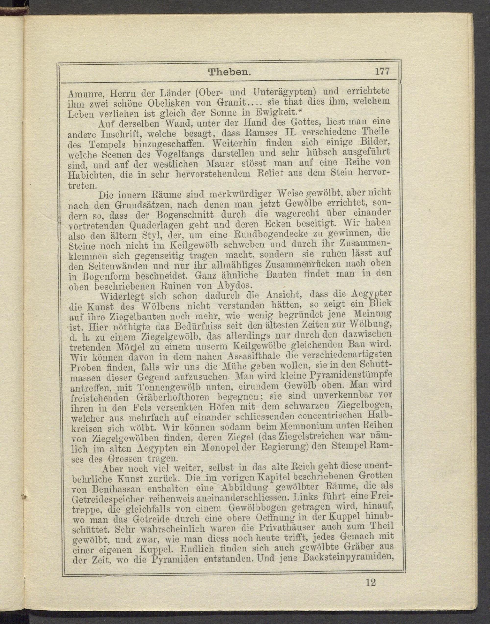Widerlegt sich schon dadurch die Ansicht, dass die Aegypter die Kunst des Wölbens nicht verstanden hätten, so zeigt ein Blick auf ihre Ziegelbauten noch mehr, wie wenig begründet jene Meinung ist. Hier nöthigte das Bedürfnis seit den ältesten Zeiten zur Wölbung, d. h. zu einem Ziegelgewölb, das allerdings nur durch den dazwischen tretenden Mörtel zu einem unserm Keilgewölbe gleichenden Bau wird. Wir können davon in dem nahen Assasifthale die verschiedenartigsten Proben finden, falls wir uns die Mühe gehen wollen, sie in den Schuttmassen dieser Gegend aufzusuchen. Man wird kleine Pyramidenstümpfe antreffen, mit Tonnengewölb unten, eirundem Gewölb oben. Man wird freistehenden Gräberhofthoren begegnen; sie sind unverkennbar vor ihren in den Fels versenkten Höfen mit dem schwarzen Ziegelbogcn, welcher ans mehrfach auf einander schliessenden concentrischen Halbkreisen sich wölbt. Wir können sodann heim Memnonium unten Reihen von Ziegelgewölben finden, deren Ziegel (das Ziegelstreichen war nämlich im alten Aegypten ein Monopol der Regierung) den Stempel Ram- ses des Grossen tragen.