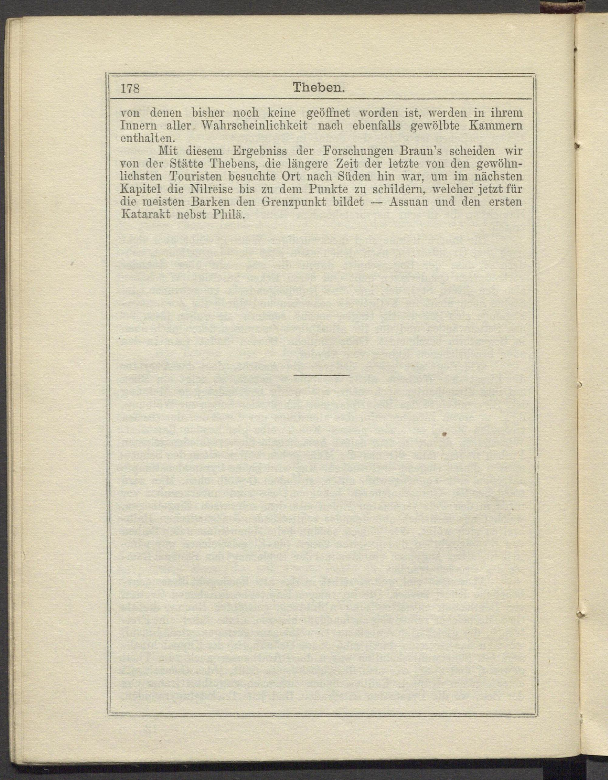 Mit diesem Ergebniss der Forschungen Braun’s scheiden wir von der Stätte Thebens, die längere Zeit der letzte von den gewöhnlichsten Touristen besuchte Ort nach Süden hin war, um im nächsten Kapitel die Nilreise bis zu dem Punkte zu schildern, welcher jetzt für die meisten Barken den Grenzpunkt bildet — Assuan und den ersten Katarakt nebst Philä.