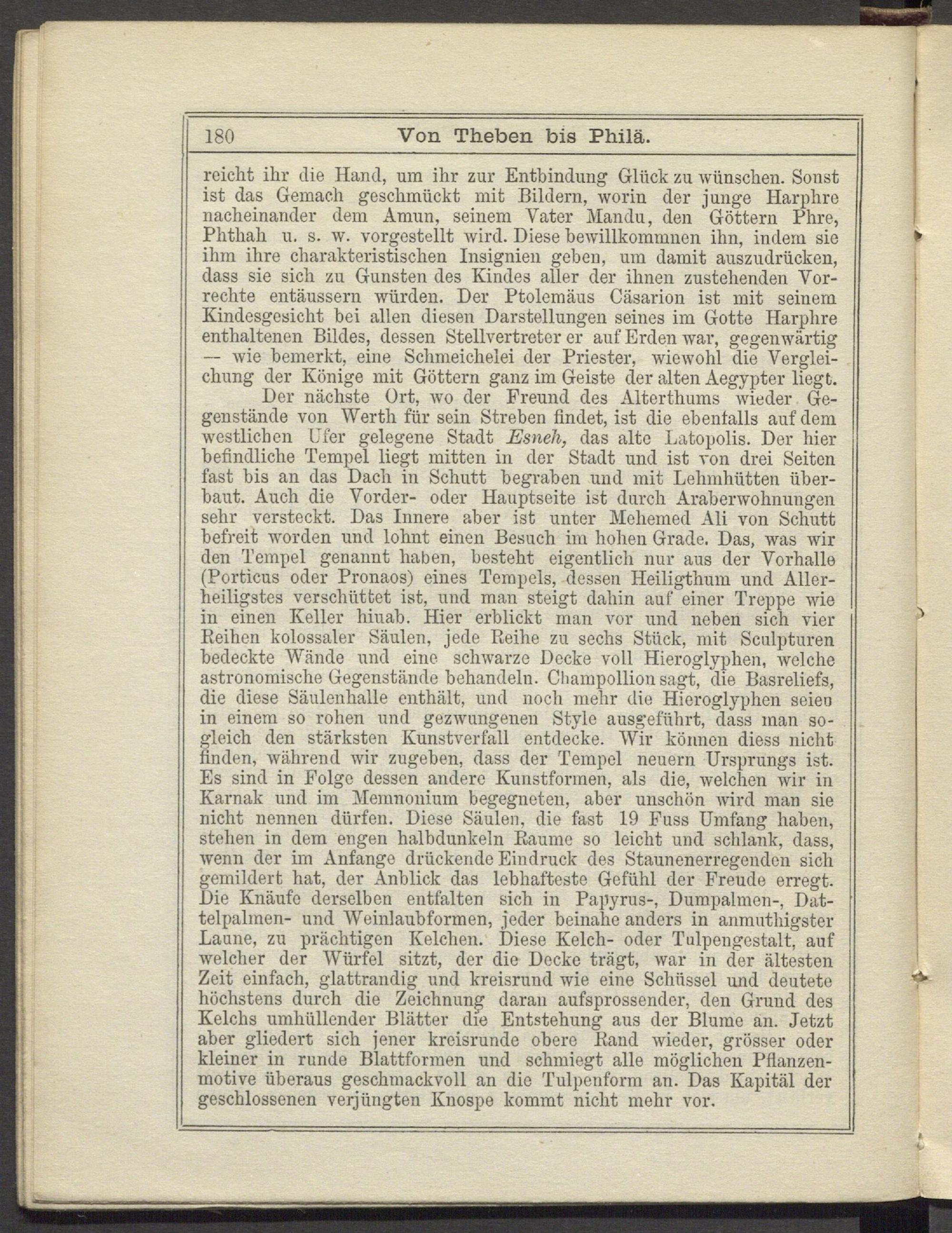 Der nächste Ort, wo der Freund des Alterthums wieder Gegenstände von Werth für sein Streben findet, ist die ebenfalls auf dem westlichen Efer gelegene Stadt Esneh, das alte Latopolis. Der hier befindliche Tempel liegt mitten in der Stadt und ist von drei Seiten fast bis an das Dach in Schutt begraben und mit Lehmhütten überbaut. Auch die Vorder- oder Hauptseite ist durch Araberwohnungen sehr versteckt. Das Innere aber ist unter Meliemed Ali von Schutt befreit w'orden und lohnt einen Besuch im hohen Grade. Das, was wir den Tempel genannt haben, besteht eigentlich nur aus der Vorhalle (Porticus oder Pronaos) eines Tempels, dessen Heiligthum und Allerheiligstes verschüttet ist, und man steigt dahin auf einer Treppe wie in einen Keller hinab. Hier erblickt man vor und neben sich vier Reihen kolossaler Säulen, jede Reihe zu sechs Stück, mit Scnlpturen bedeckte Wände und eine schwarze Decke voll Hieroglyphen, welche astronomische Gegenstände behandeln. Champollionsagt, die Basreliefs, die diese Säulenhalle enthält, und noch mehr die Hieroglyphen seien in einem so rohen und gezwungenen Stylo ausgeführt, dass man sogleich den stärksten Kunstverfall entdecke. Wir können diess nicht finden, während wir zugeben, dass der Tempel neuern Ursprungs ist. Es sind in Folge dessen andere Kunstformen, als die, welchen wir in Karnak und im Jlemnonium begegneten, aber unschön wird man sie nicht nennen dürfen. Diese Säulen, die fast 19 Fuss Umfang haben, stehen in dem engen halbdunkeln Raume so leicht und schlank, dass, wenn der im Anfänge drückende Eindruck des Staunenerregenden sich gemildert hat, der Anblick das lebhafteste Gefühl der Freude erregt. Die Knäufe derselben entfalten sich in Papyrus-, Dumpalmen-, Dattelpalmen- und Weinlaubformen, jeder beinahe anders in anmnthigster Laune, zu prächtigen Kelchen. Diese Kelch- oder Tulpengestalt, auf welcher der Würfel sitzt, der die Docke trägt, war in der ältesten Zeit einfach, glattrandig und kreisrund wie eine Schüssel und deutete höchstens durch die Zeichnung daran aufsprossender, den Grund des Kelchs umhüllender Blätter die Entstehung aus der Blume an. Jetzt aber gliedert sich jener kreisrunde obere Rand wieder, grösser oder kleiner in runde Blattformen und schmiegt alle möglichen Pflanzenmotive überaus geschmackvoll an die Tulpenform an. Das Kapital der geschlossenen verjüngten Knospe kommt nicht mehr vor.