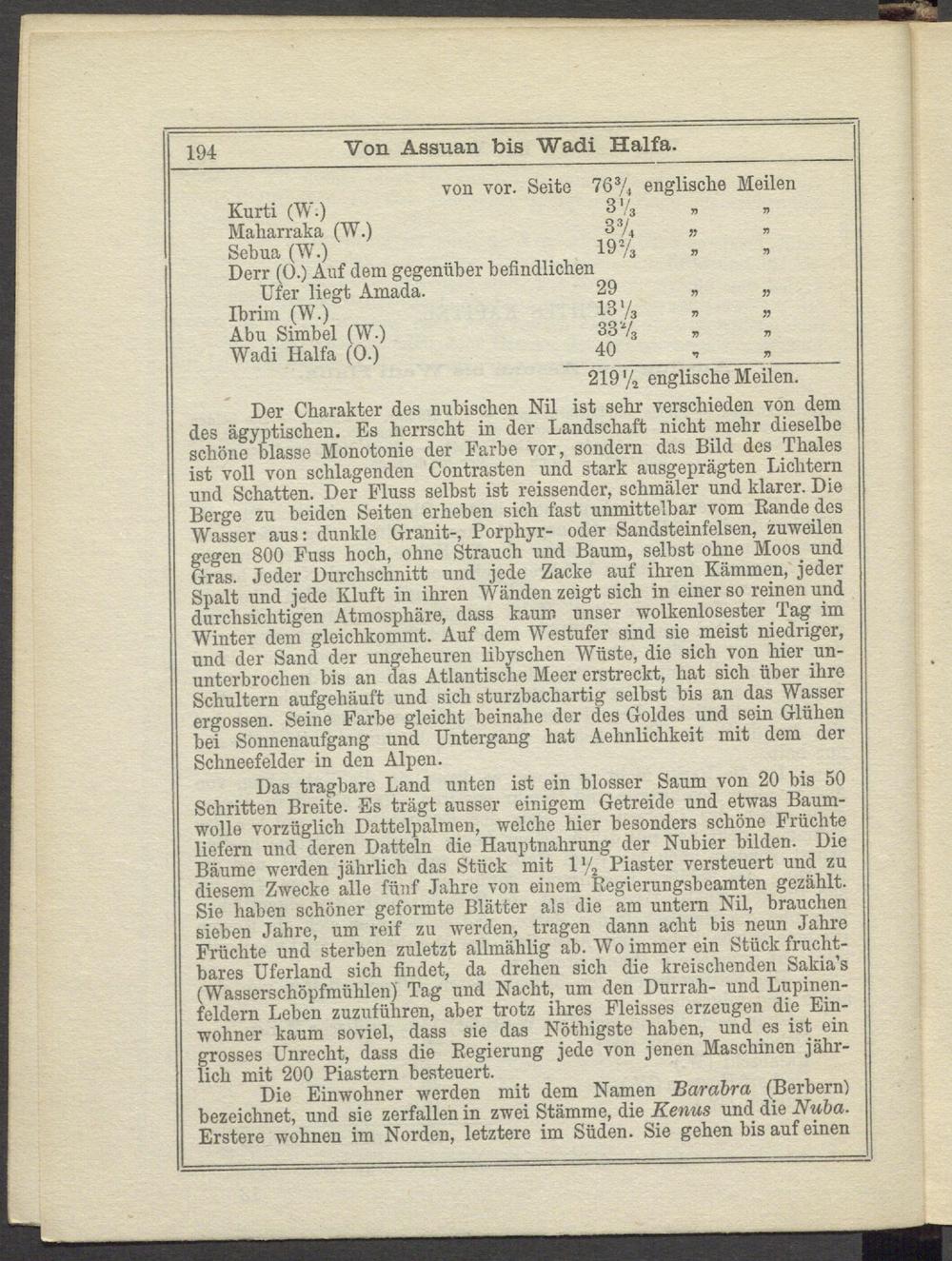 Der Charakter des nubischen Nil ist sehr verschieden von dem des ägyptischen. Es herrscht in der Landschaft nicht mehr dieselbe schöne blasse Monotonie der Farbe vor, sondern das Bild des Thaies ist voll von schlagenden Contrasten und stark ausgeprägten Lichtern und Schatten. Der Fluss selbst ist reissender, schmäler und klarer. Die Berge zu beiden Seiten erheben sich fast unmittelbar vom Bande des Wasser aus: dunkle Granit-, Porphyr- oder Sandsteinfelsen, zuweilen gegen 800 Fuss hoch, ohne Strauch und Baum, selbst ohne Moos und Gras. Jeder Durchschnitt und jede Zacke auf ihren Kämmen, jeder Spalt und jede Kluft in ihren Wänden zeigt sich in einer so reinen und durchsichtigen Atmosphäre, dass kaum unser wolkenlosester Tag im Winter dem gleichkommt. Auf dem Westufer sind sie meist niedriger, und der Sand der ungeheuren libyschen Wüste, die sich von hier ununterbrochen bis an das Atlantische Meer erstreckt, hat sich über ihre Schultern aufgehäuft und sich sturzbachartig selbst bis an das Wasser ergossen. Seine Farbe gleicht beinahe der des Goldes und sein Glühen bei Sonnenaufgang und Untergang hat Aelinlichkeit mit dem der Schneefelder in den Alpen.