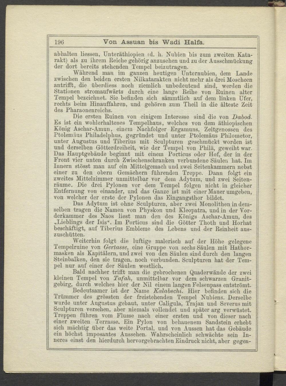 Während man im ganzen heutigen Unternubien, dem Lande zwischen den beiden ersten Nilkatarakten nicht mehr als drei Moscheen antrifft, die überdiess noch ziemlich unbedeutend sind, werden die Stationen stromaufwärts durch eine lange Beihe von Buinen alter Tempel bezeichnet. Sie befinden sich sämmtlich auf dem linken Ufer, rechts beim Hinauffahren, und gehören zum Theil in die älteste Zeit des Pharaonenreichs.