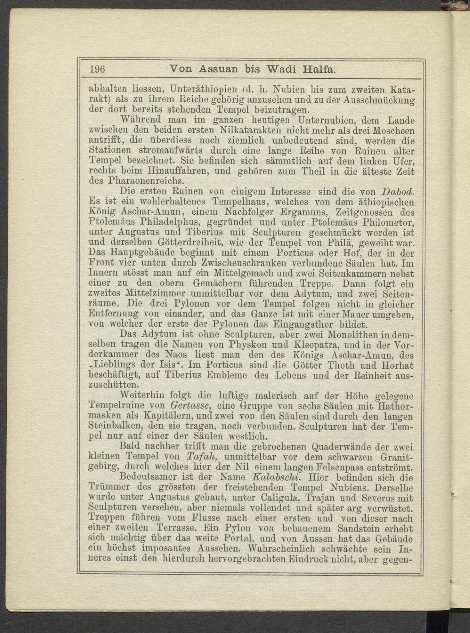 Die ersten Euinen von einigem Interesse sind die von Dabod. Es ist ein wohlerhaltenes Tempelhaus, welches von dem äthiopischen König Aschar-Amun, einem Nachfolger Ergamuns, Zeitgenossen des Ptolemäus Philadelplius, gegründet und unter Ptolemäus Philometor, unter Augustus und Tiberius mit Sculpturen geschmückt worden ist und derselben Götterdreiheit, wie der Tempel von Philä, geweiht war. Das Hauptgebäude beginnt mit einem Porticus oder Hof, der in der Front vier unten durch Zwischenschranken verbundene Säulen hat. Im Innern stösst man auf ein Mittelgemach und zwei Seitenkammern nebst einer zu den obern Gemächern führenden Treppe. Dann folgt ein zweites Mittelzimmer unmittelbar vor dem Adytum, und zwei Seitenräume. Die drei Pylonen vor dem Tempel folgen nicht in gleicher Entfernung von einander, und das Ganze ist mit einer Mauer umgeben, von welcher der erste der Pylonen das Eingangsthor bildet.
