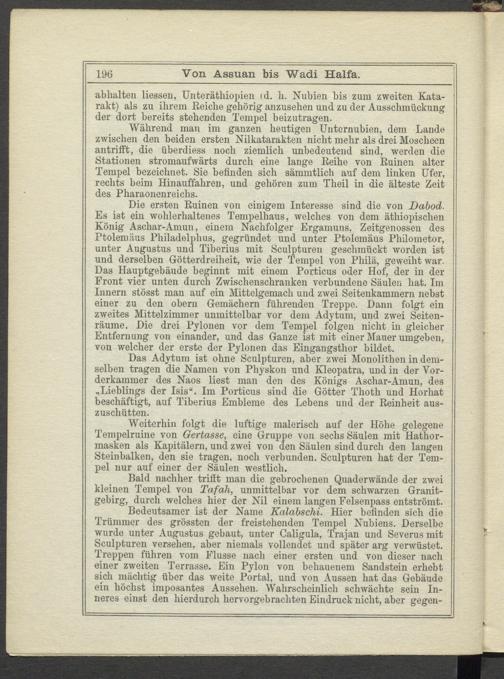 Bedeutsamer ist der Name Kalabschi. Hier befinden sich die Trümmer des grössten der freistehenden Tempel Nubiens. Derselbe wurde unter Augustus gebaut, unter Caligula, Trajan und Severus mit Sculpturen versehen, aber niemals vollendet und später arg verwüstet. Treppen führen vom Flusse nach einer ersten und von dieser nach einer zweiten Terrasse. Ein Pylon von behauenem Sandstein erhebt sich mächtig über das weite Portal, und von Aussen hat das Gebäude ein höchst imposantes Aussehen. Wahrscheinlich schwächte sein Inneres einst den hierdurch hervorgebrachten Eindruck nicht, aber gegen-