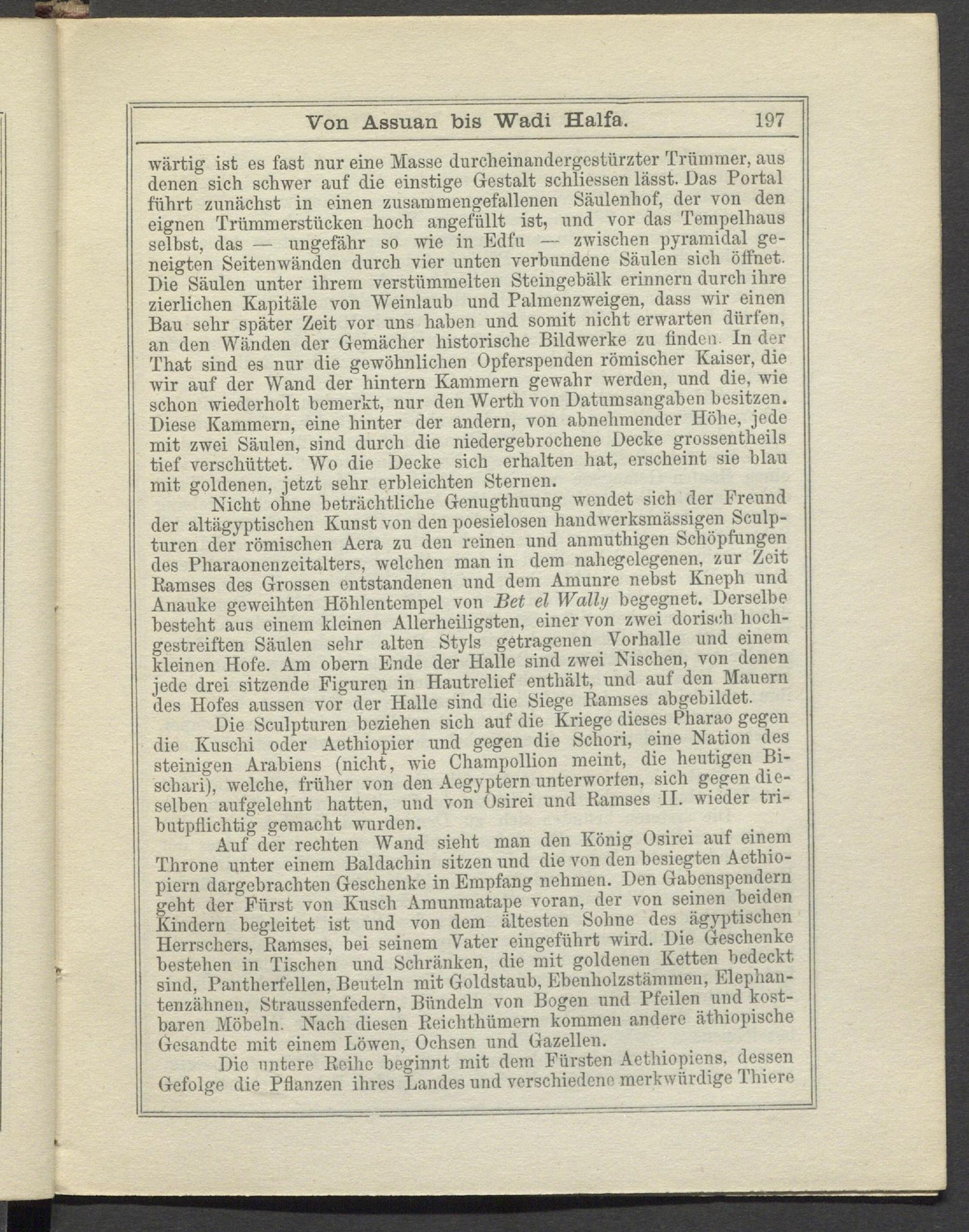 wärtig ist es fast nur eine Masse durcheinandergestürzter Trümmer, aus denen sich schwer auf die einstige Gestalt schliessen lässt. Das Portal führt zunächst in einen zusammengefallenen Säulenhof, der von den eignen Trümmerstücken hoch angefüllt ist, und vor das Tempelhaus selbst, das — ungefähr so wie in Edfu — zwischen pyramidal geneigten Seitenwänden durch vier unten verbundene Säulen sich öffnet. Die Säulen unter ihrem verstümmelten Steingebälk erinnern durch ihre zierlichen Kapitale von Weinlaub und Palmenzweigen, dass wir einen Bau sehr später Zeit vor uns haben und somit nicht erwarten dürfen, an den Wänden der Gemächer historische Bildwerke zu finden. In der That sind es nur die gewöhnlichen Opferspenden römischer Kaiser, die wir auf der Wand der hintern Kammern gewahr werden, und die, wie schon wiederholt bemerkt, nur den Werth von Datumsangaben besitzen. Diese Kammern, eine hinter der andern, von abnehmender Höhe, jede mit zwei Säulen, sind durch die niedergebrochene Decke grossentheils tief verschüttet. Wo die Decke sich erhalten hat, erscheint sie blau mit goldenen, jetzt sehr erbleichten Sternen.