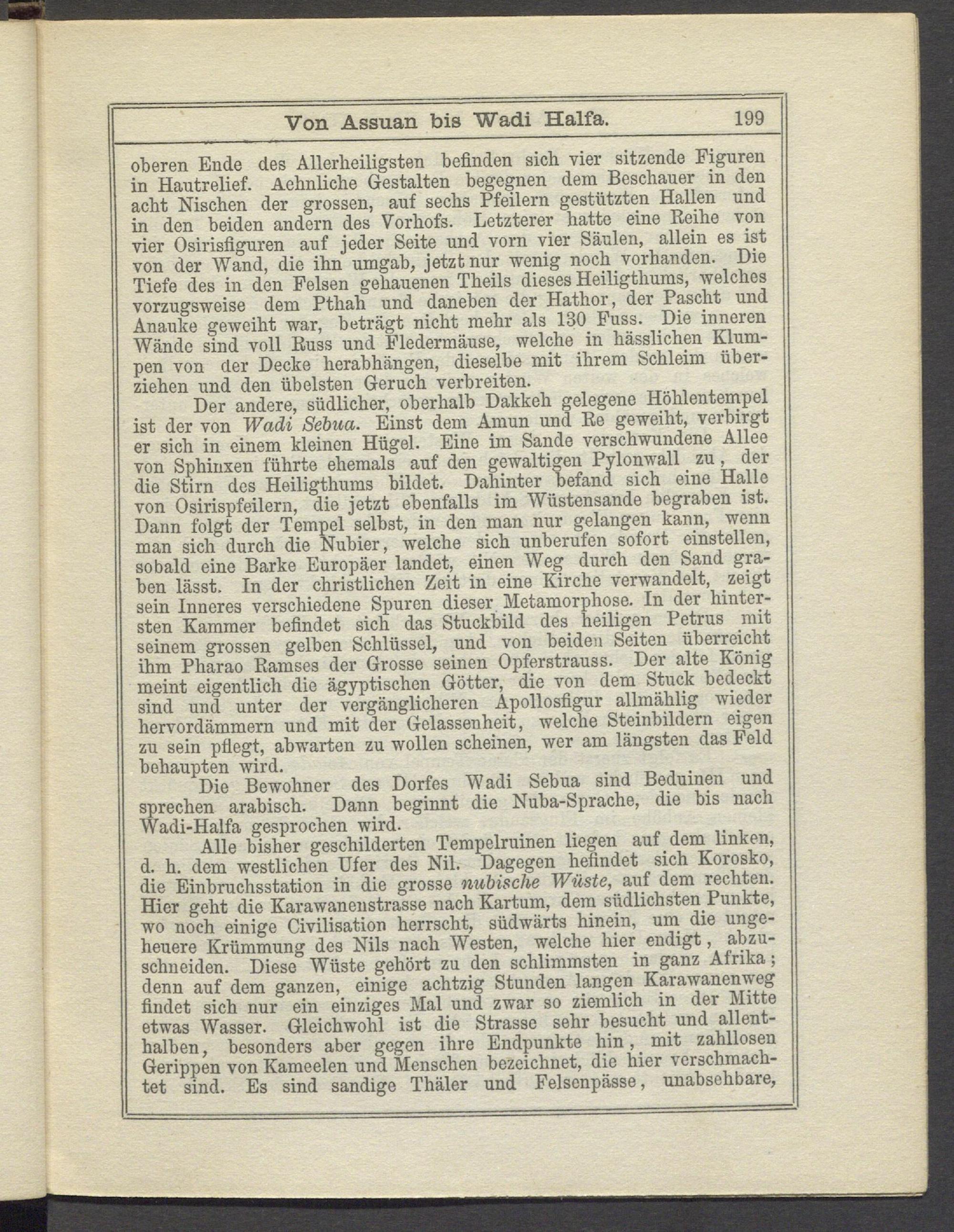 Der andere, südlicher, oberhalb Dakkeh gelegene Höhlentempel ist der von Wadi Sebua. Einst dem Amun und Re geweiht, verbirgt er sich in einem kleinen Hügel. Eine im Sande verschwundene Allee von Sphinxen führte ehemals auf den gewaltigen Pylonwall zu, der die Stirn des Heiligthums bildet. Dahinter befand sich eine Halle von Osirispfeilern, die jetzt ebenfalls im Wüstensande begraben ist. Dann folgt der Tempel selbst, in den man nur gelangen kann, wenn man sich durch die Nubier, welche sich unberufen sofort einstellen, sobald eine Barke Europäer landet, einen Weg durch den Sand graben lässt. In der christlichen Zeit in eine Kirche verwandelt, zeigt sein Inneres verschiedene Spuren dieser Metamorphose. In der hintersten Kammer befindet sich das Stuckbild des heiligen Petrus mit seinem grossen gelben Schlüssel, und von beiden Seiten überreicht ihm Pharao Ramses der Grosse seinen Opferstrauss. Der alte König meint eigentlich die ägyptischen Götter, die von dem Stuck bedeckt sind und unter der vergänglicheren Apollosfigur allmählig wieder hervordämmern und mit der Gelassenheit, welche Steinbildern eigen zu sein pflegt, abwarten zu wollen scheinen, wer am längsten das Feld behaupten wird.