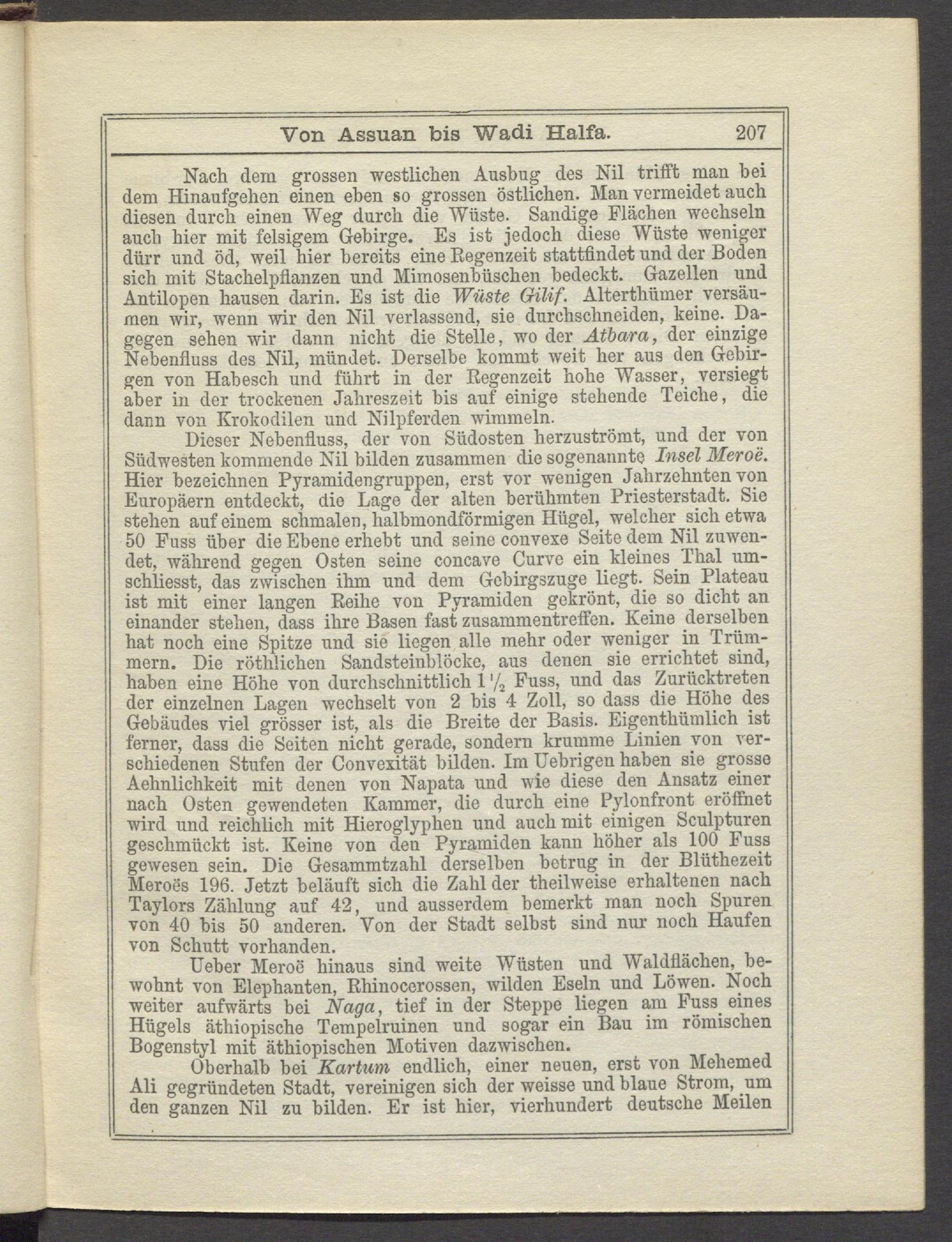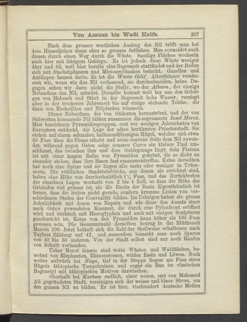 Ueber Meroe hinaus sind weite Wüsten und Waldflächen, bewohnt von Elephanten, Bhinocerossen, wilden Eseln und Löwen. Noch weiter aufwärts bei Naga, tief in der Steppe liegen am Fuss. eines Hügels äthiopische Tempelruinen und sogar ein Bau im römischen Bogenstyl mit äthiopischen Motiven dazwischen.