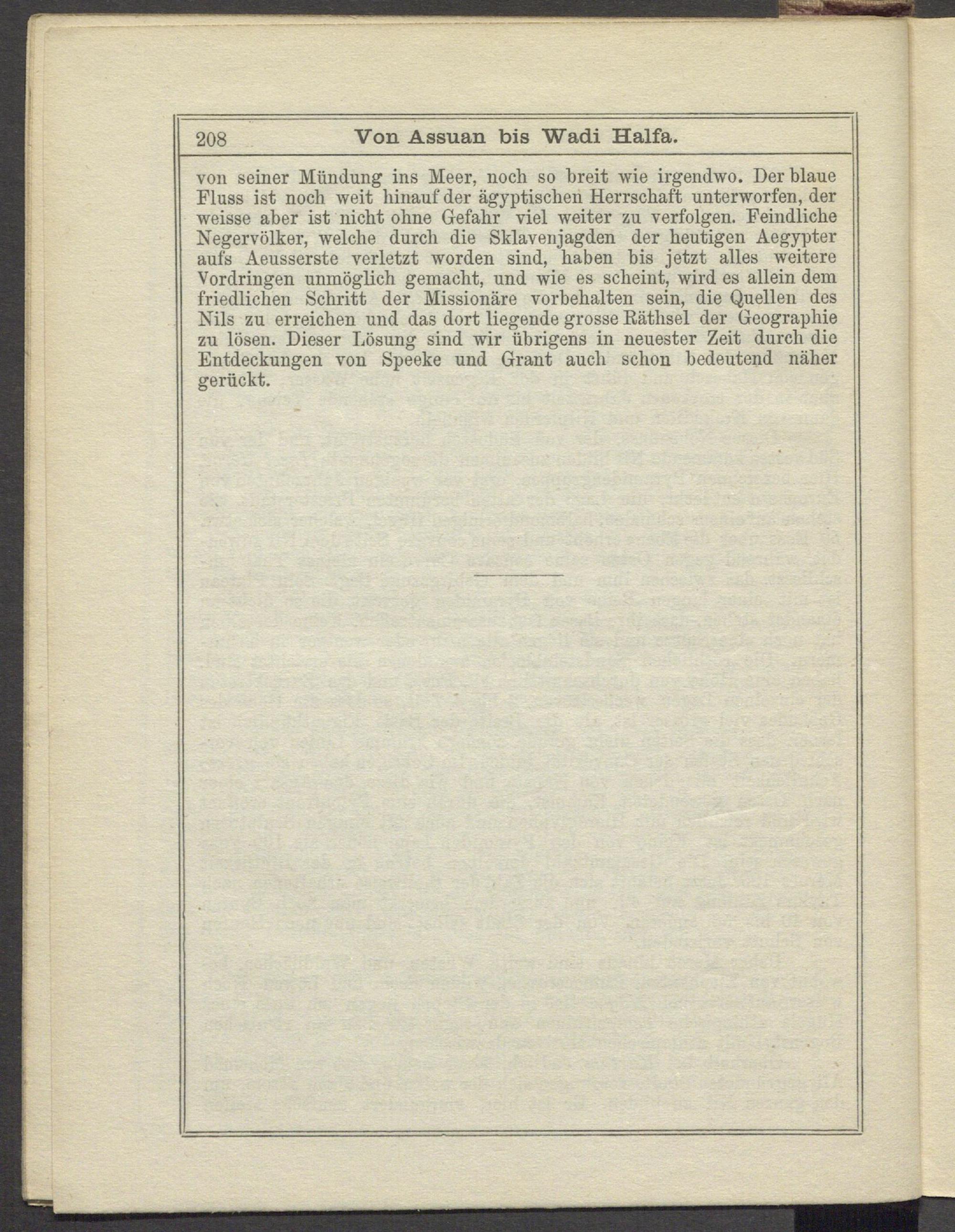 von seiner Mündung ins Meer, noch so breit wie irgendwo. Derblaue Fluss ist noch weit hinauf der ägyptischen Herrschaft unterworfen, der weisse aber ist nicht ohne Gefahr viel weiter zu verfolgen. Feindliche Negervölker, welche durch die Sklavenjagden der heutigen Aegypter aufs Aeusserste verletzt worden sind, haben bis jetzt alles weitere Vordringen unmöglich gemacht, und wie es scheint, wird es allein dem friedlichen Schritt der Missionäre Vorbehalten sein, die Quellen des Nils zu erreichen und das dort liegende grosse Rätlisel der Geographie zu lösen. Dieser Lösung sind wir übrigens in neuester Zeit durch die Entdeckungen von Speeke und Grant auch schon bedeutend näher gerückt.