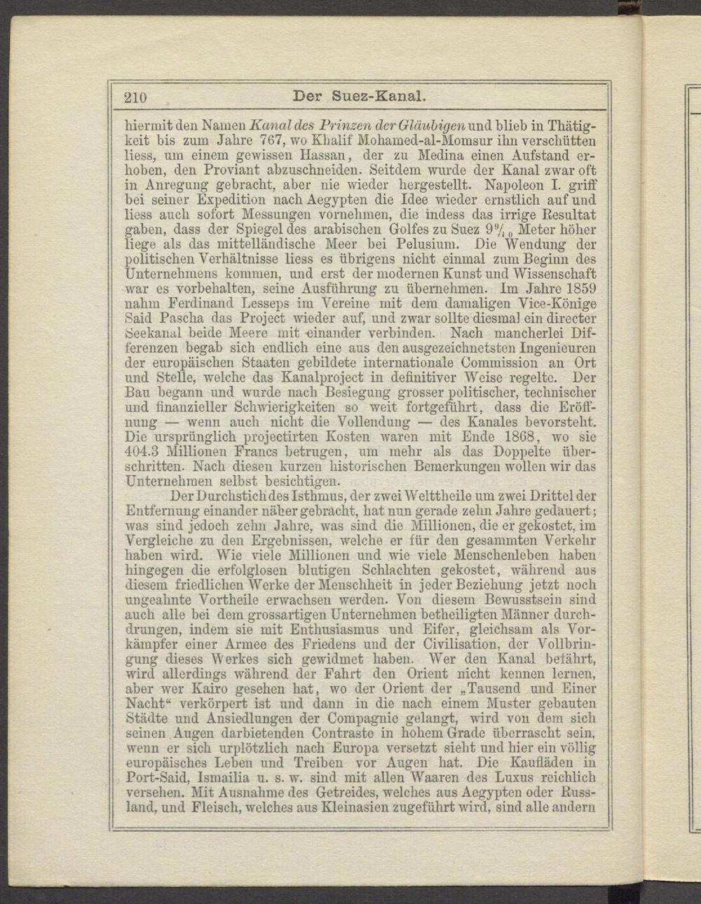 hiermit den Namen Kanal des Prinzen der Gläubigen und blieb in Thätig- keit bis zum Jahre 767, wo Khalif Mohamed-al-Momsur ihn verschütten liess, um einem gewissen Hassan, der zu Medina einen Aufstand erhoben, den Proviant abzuschneiden. Seitdem wurde der Kanal zwar oft in Anregung gebracht, aber nie wieder hergestellt. Napoleon I. griff bei seiner Expedition nach Aegypten die Idee wieder ernstlich auf und liess auch sofort Messungen vornehmen, die indess das irrige Resultat gaben, dass der Spiegel des arabischen Golfes zu Suez 9 „ Meter höher liege als das mittelländische Meer bei Pelusium. Die Wendung der politischen Verhältnisse liess es übrigens nicht einmal zum Beginn des Unternehmens kommen, und erst der modernen Kunst und Wissenschaft war es Vorbehalten, seine Ausführung zu übernehmen. Im Jahre 1859 nahm Ferdinand Lesseps im Vereine mit dem damaligen Vice-Könige Said Pascha das Project wieder auf, und zwar sollte diesmal ein directer Seekanal beide Meere mit einander verbinden. Nach mancherlei Differenzen begab sich endlich eine aus den ausgezeichnetsten Ingenieuren der europäischen Staaten gebildete internationale Commission an Ort und Stelle, welche das Kanalproject in definitiver Weise regelte. Der Bau begann und wurde nach Besiegung grosser politischer, technischer und finanzieller Schwierigkeiten so weit fortgeführt, dass die Eröffnung — wenn auch nicht die Vollendung — des Kanales bevorsteht. Die ursprünglich projectirten Kosten waren mit Ende 1808, wo sie 404.3 Millionen Francs betrugen, um mehr als das Doppelte überschritten. Nach diesen kurzen historischen Bemerkungen wollen wir das Unternehmen selbst besichtigen.