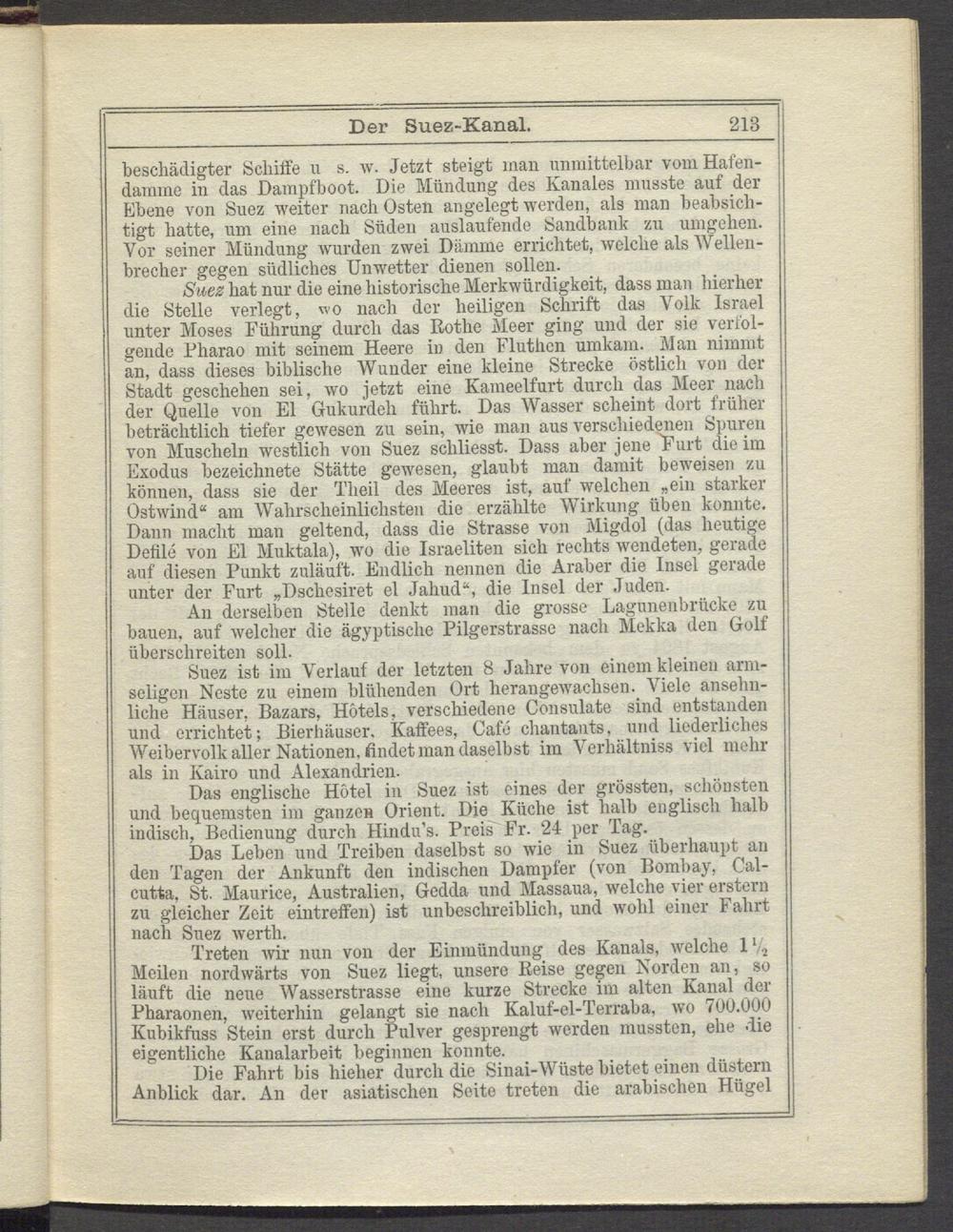 Das englische Hotel in Suez ist eines der grössten, schönsten und bequemsten im ganze» Orient. Die Küche ist halb englisch halb indisch, Bedienung durch Hindn’s. Preis Fr. 24 per Tag.