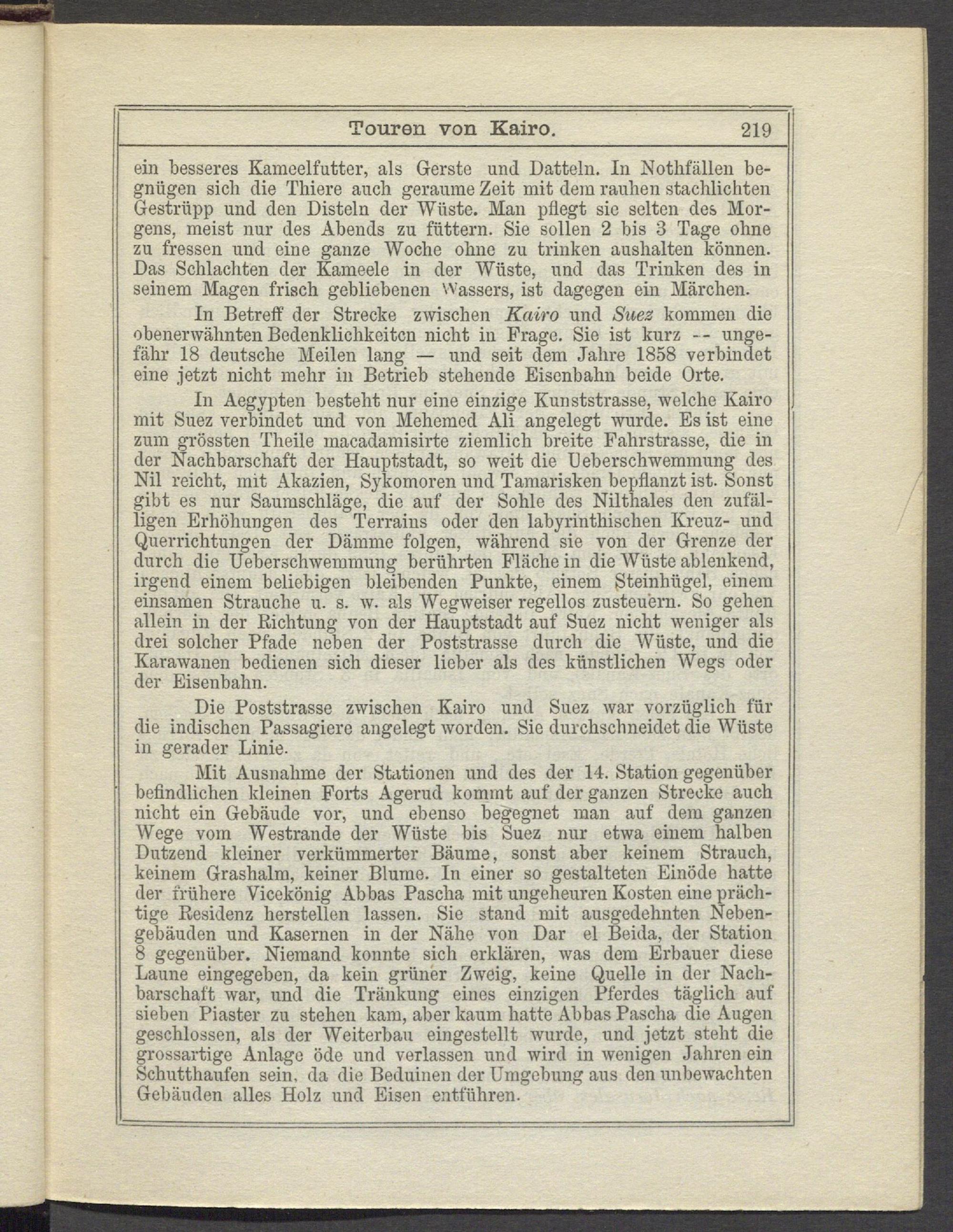 Mit Ausnahme der Stationen und des der 14. Station gegenüber befindlichen kleinen Forts Agerud kommt auf der ganzen Strecke auch nicht ein Gebäude vor, und ebenso begegnet man auf dem ganzen Wege vom Westrande der Wüste bis Suez nur etwa einem halben Dutzend kleiner verkümmerter Bäume, sonst aber keinem Strauch, keinem Grashalm, keiner Blume. In einer so gestalteten Einöde hatte der frühere Vicekönig Abbas Pascha mit ungeheuren Kosten eine prächtige Residenz hersteilen lassen. Sie stand mit ausgedehnten Nebengebäuden und Kasernen in der Nähe von Dar el Beida, der Station 8 gegenüber. Niemand konnte sich erklären, was dem Erbauer diese Laune eingegeben, da kein grüner Zweig, keine Quelle in der Nachbarschaft war, und die Tränkung eines einzigen Pferdes täglich auf sieben Piaster zu stehen kam, aber kaum hatte Abbas Pascha die Augen geschlossen, als der Weiterbau eingestellt wurde, und jetzt steht die grossartige Anlage öde und verlassen und wird in wenigen Jahren ein Schutthaufen sein, da die Beduinen der Umgebung aus den unbewachten Gebäuden alles Holz und Eisen entführen.