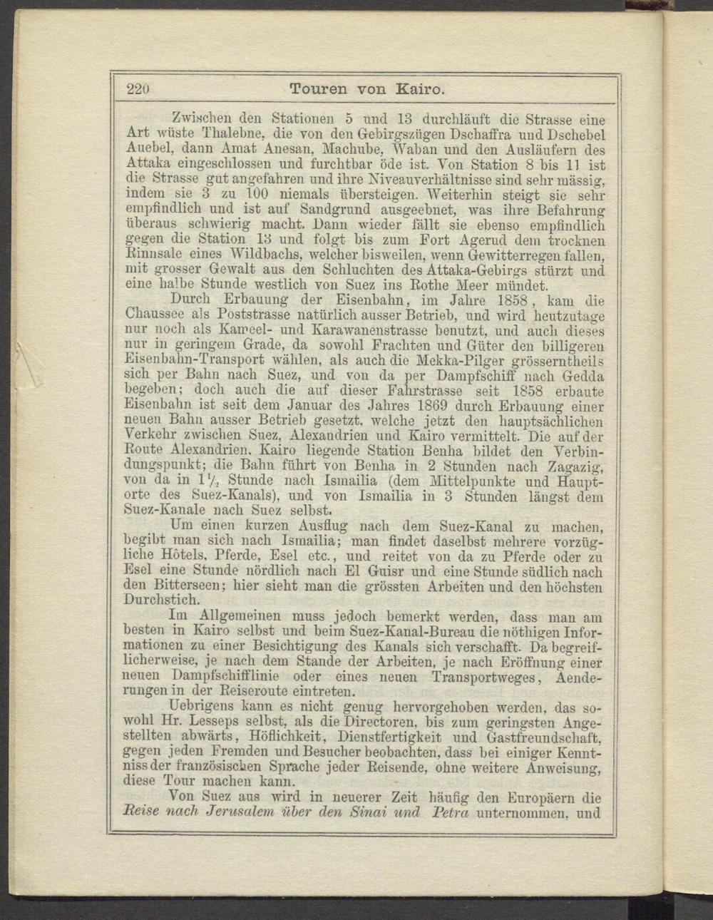 Im Allgemeinen muss jedoch bemerkt werden, dass man am besten in Kairo selbst und beim Suez-Kanal-Bureau die nöthigen Informationen zu einer Besichtigung des Kanals sich verschafft. Da begreiflicherweise, je nach dem Stande der Arbeiten, je nach Eröffnung einer neuen Dampfschifflinie oder eines neuen Transportweges, Aende- rungen in der Reiseroute eintreten.