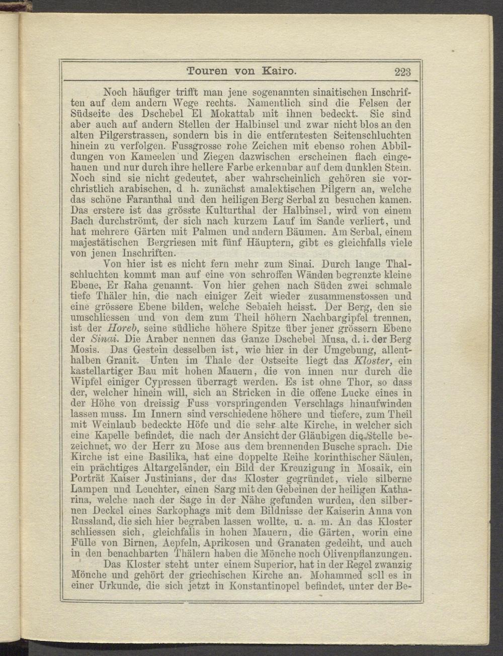 Noch häufiger trifft man jene sogenannten sinaitischen Inschriften auf dem andern Wege rechts. Namentlich sind die Felsen der Südseite des Dschebel El Mokattab mit ihnen bedeckt. Sie sind aber auch auf andern Stellen der Halbinsel und zwar nicht blos an den alten Pilgerstrassen, sondern bis in die entferntesten Seitenschluchten hinein zu verfolgen. Fussgrosse rohe Zeichen mit ebenso rohen Abbildungen von Kameelen und Ziegen dazwischen erscheinen flach eingehauen und nur durch ihre hellere Farbe erkennbar auf dem dunklen Stein. Noch sind sie nicht gedeutet, aber wahrscheinlich gehören sie vorchristlich arabischen, d h. zunächst amalektischen Pilgern an, welche das schöne Faranthal und den heiligen Berg Serbal zu besuchen kamen. Das crstere ist das grösste Kulturthal der Halbinsel, wird von einem Bach durchströmt, der sich nach kurzem Lauf im Sande verliert, und hat mehrere Gärten mit Palmen und andern Bäumen. Am Serbal, einem majestätischen Bergriesen mit fünf Häuptern, gibt es gleichfalls viele von jenen Inschriften.