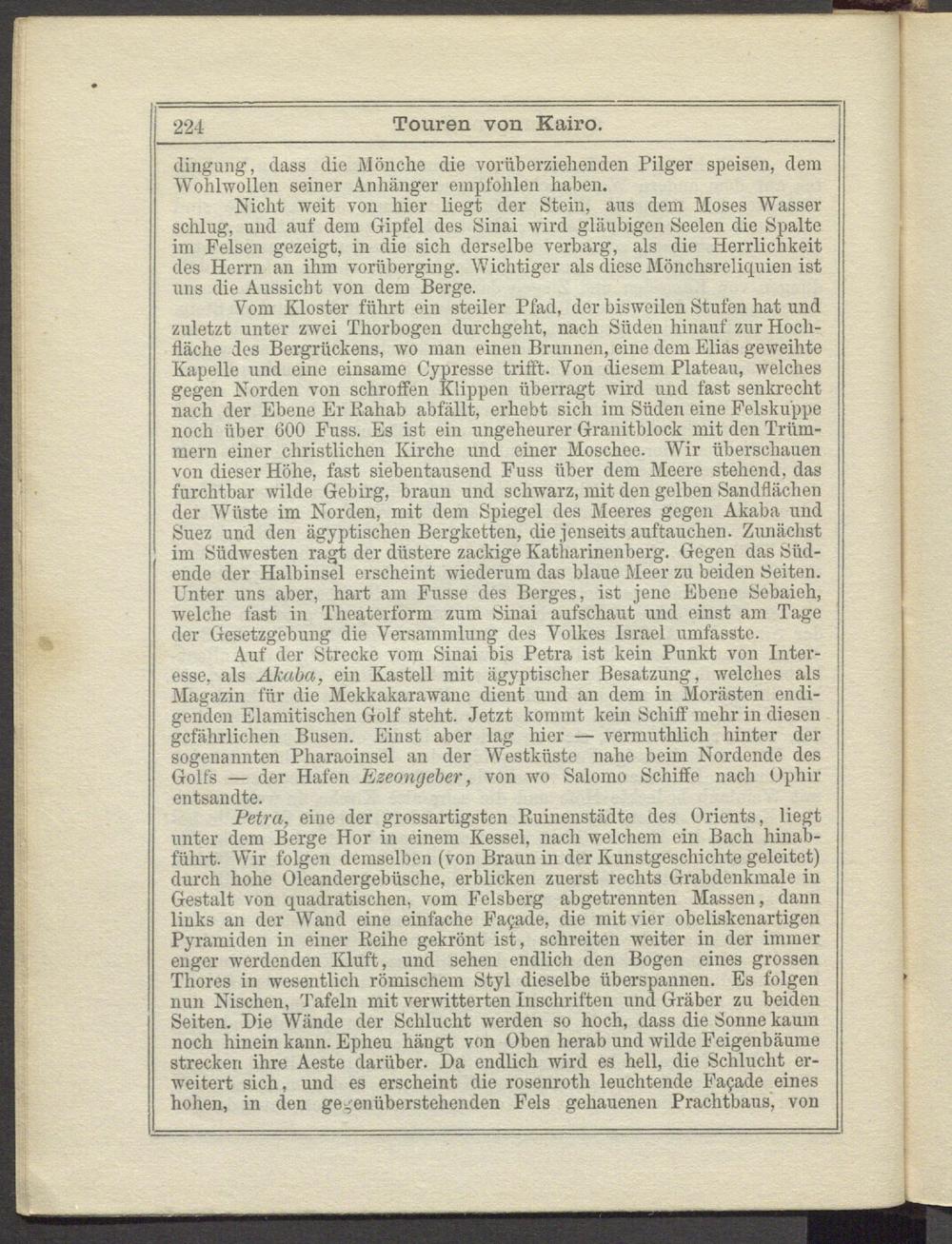 Auf der Strecke vom Sinai bis Petra ist kein Punkt von Interesse, als Akaba, ein Kastell mit ägyptischer Besatzung, welches als Magazin für die Mekkakarawane dient und an dem in Morästen endigenden Elamitischen Golf steht. Jetzt kommt kein Schiff mehr in diesen gefährlichen Busen. Einst aber lag hier — vermuthlich hinter der sogenannten Pharaoinsel an der Westküste nahe beim Nordende des Golfs — der Hafen Ezeongeber, von wo Salomo Schiffe nach Ophir entsandte.