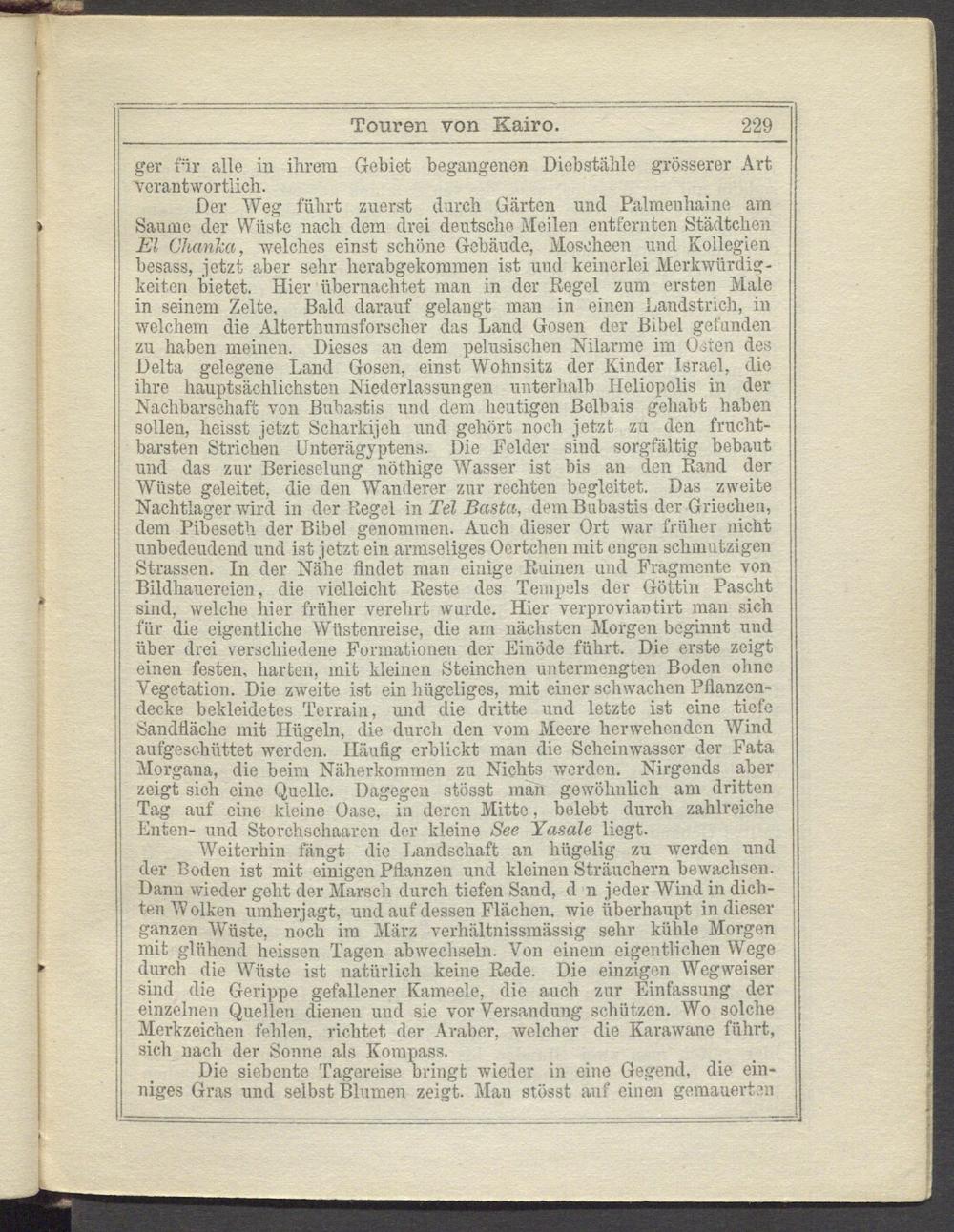 Der Weg führt zuerst durch Gärten und Palmenhaine am Saume der Wüste nach dem drei deutscho Meilen entfernten Städtchen El CJtanlca, welches einst schöne Gebäude, Moscheen und Kollegien besass, jetzt aber sehr herabgekommen ist und keinerlei Merkwürdigkeiten bietet. Hier übernachtet man in der Regel zum ersten Male in seinem Zelte. Bald darauf gelangt man in einen Landstrich, in welchem die Altorthnmsforscher das Land Gosen der Bibel gefunden zu haben meinen. Dieses an dem pelnsischen Nilarme im Osten des Delta gelegene Land Gosen, einst Wohnsitz der Kinder Israel, die ihre hauptsächlichsten Niederlassungen unterhalb Heliopolis in der Nachbarschaft von Bubastis und dem heutigen ßelbais gehabt haben sollen, heisst jetzt Scharkijeh und gehört noch jetzt zu den fruchtbarsten Strichen Unterägyptens. Die Felder sind sorgfältig bebaut und das zur Berieselung nöthige Wasser ist bis an den Rand der Wüste geleitet, die den 'Wanderer zur rechten begleitet. Das zweite Nachtlager wird in der Regel in Tel Basta, dem Bubastis der Griechen, dem Pibeseth der Bibel genommen. Auch dieser Ort war früher nicht unbedeudend und ist jetzt ein armseliges Oertchen mit engen schmutzigen Strassen. In der Nähe findet man einige Ruinen und Fragmente von Bildhauereien, die vielleicht Reste des Tempels der Göttin Pascht sind, welche hier früher verehrt wurde. Hier verproviantirt man sich für die eigentliche Wüstenreise, die am nächsten Morgen beginnt und über drei verschiedene Formationen der Einöde führt. Die erste zeigt einen festen, harten, mit kleinen Sternchen untermengten Boden ohne Vegetation. Die zweite ist ein hügeliges, mit einer schwachen Pflanzendecke bekleidetes Terrain, und die dritte und letzte ist eine tiefe Öandfläclio mit Hügeln, die durch den vom Meere herwehenden Wind aufgeschüttet werden. Häufig erblickt man die Scheinwasser der Fata Morgana, die beim Näherkonnnen zu Nichts werden. Nirgends aber zeigt sich eine Quelle. Dagegen stösst man gewöhnlich am dritten Tag auf eine kleine Oase, in deren Mitte, belebt durch zahlreiche Enten- und Storchschaaren der kleine See Yasale liegt.