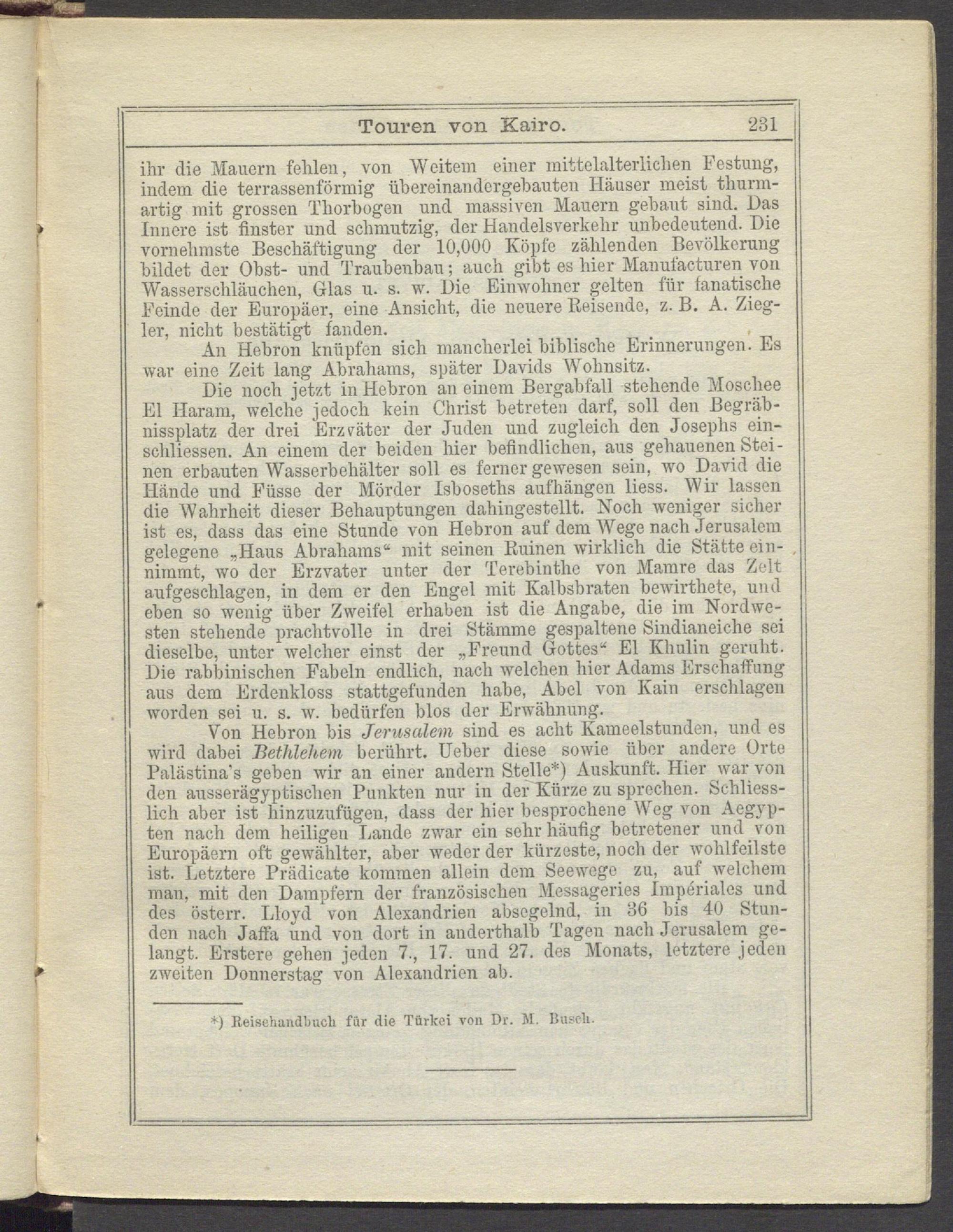 Von Hebron bis Jerusalem sind es acht Kameelstunden, und es wird dabei Bethlehem berührt. Ueber diese sowie über andere Orte Palästina's geben wir an einer andern Stelle*) Auskunft. Hier war von den ausserägyptisclien Punkten nur in der Kürze zu sprechen. Schliesslich aber ist liinzuzufügen, dass der hier besprochene Weg von Aegypten nach dem heiligen Lande zwar ein sehr häufig betretener und von Europäern oft gewählter, aber weder der kürzeste, noch der wohlfeilste ist. Letztere Prädicate kommen allein dem Seewege zu, auf welchem man, mit den Dampfern der französischen Messageries Impériales und des österr. Lloyd von Alexandrien absegelnd, in 36 bis 40 Stunden nach Jaffa und von dort in anderthalb Tagen nach Jerusalem gelangt. Erstere gehen jeden 7., 17. und 27. des Monats, letztere jeden zweiten Donnerstag von Alexandrien ab.