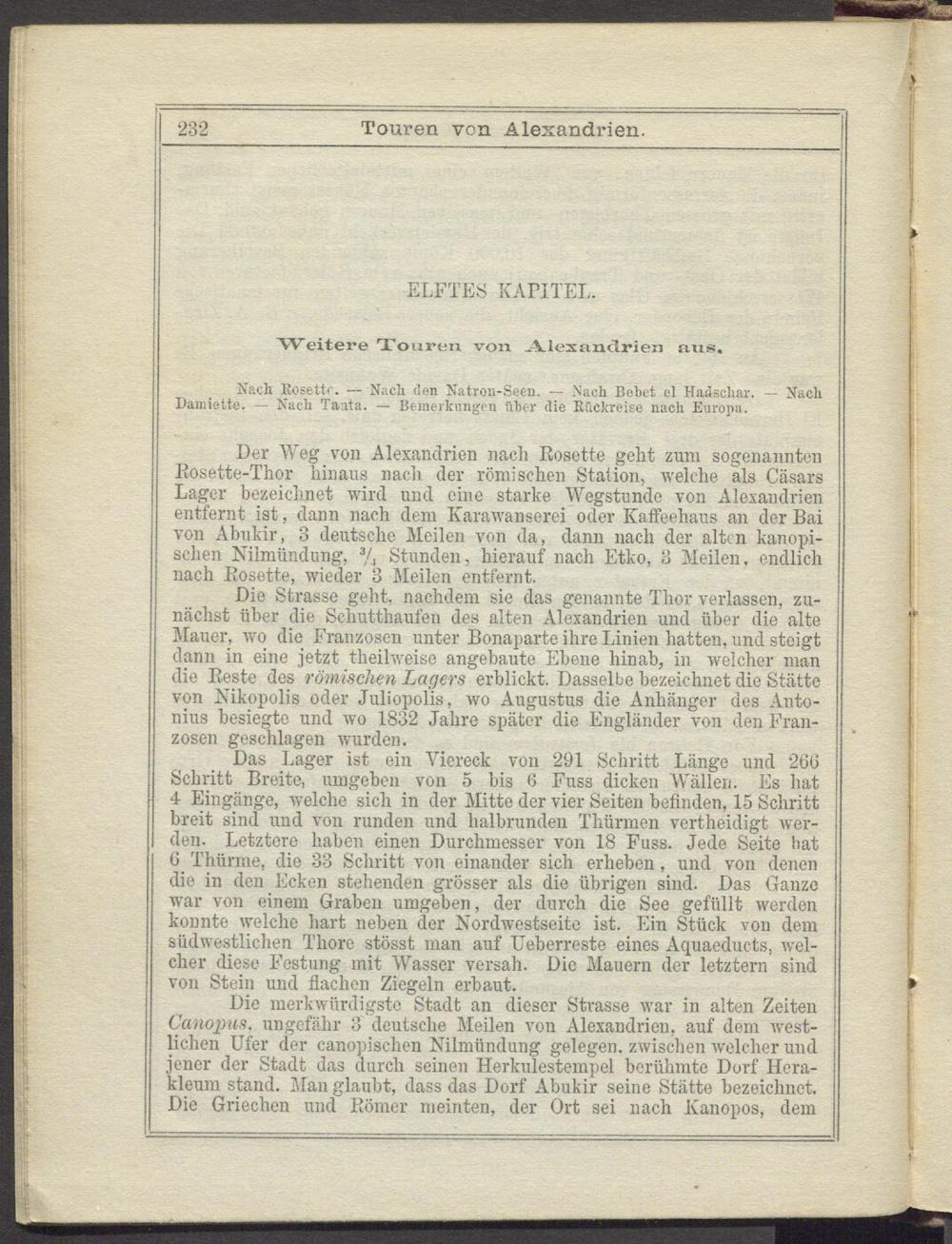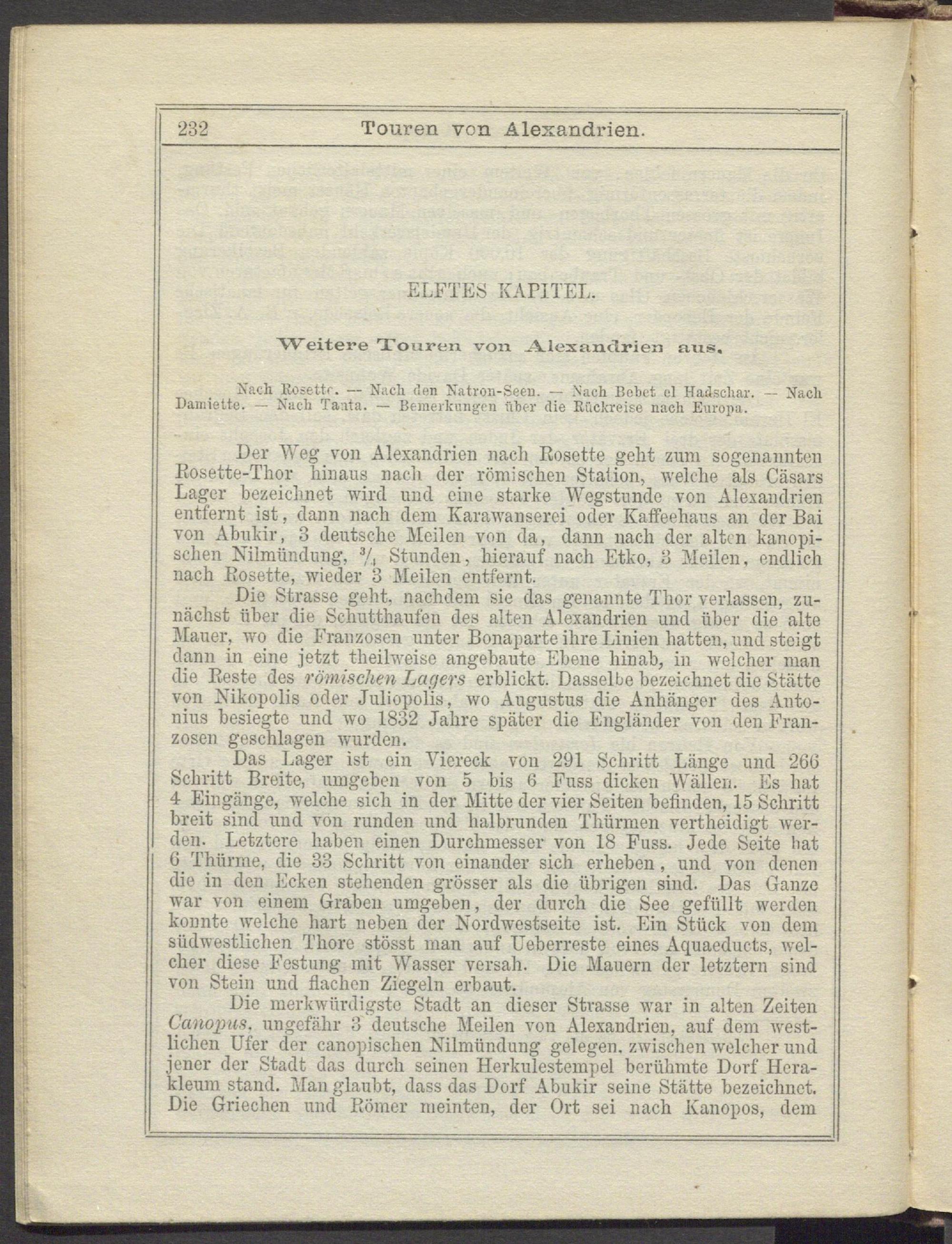 Der Weg von Alexandrien nach Rosette geht zum sogenannten Rosette-Thor hinaus nacli der römischen Station, welche als Cäsars Lager bezeichnet wird und eine starke Wegstunde von Alexandrien entfernt ist, dann nach dem Karawanserei oder Kaffeehaus an der Bai von Abukir, 3 deutsche Meilen von da, dann nach der alten kanopi- sclien Nilmündung, 3 /, Stunden, hierauf nach Etko, 3 Meilen, endlich nach Rosette, wieder 3 Meilen entfernt.