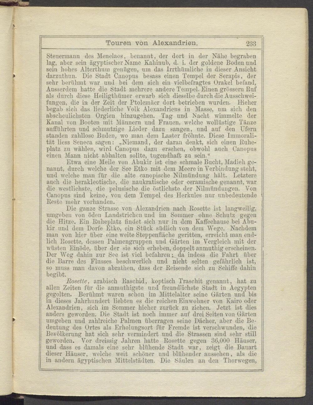 Die ganze Strasse von Alexandrien nach Rosette ist langweilig, umgeben von öden Landstrichen und im Sommer ohne Schutz gegen die Hitze. Ein Ruheplatz findet sich nur in dem Kaffeehause bei Abukir und dem Dorfe Etko, ein Stück südlich von dem Wege. Nachdem man von hier über eine weite Steppenfläche geritten, erreicht man endlich Rosette, dessen Palmengruppen und Gärten im Vergleich mit der wüsten Einöde, über der sie sich erheben, doppelt anmuthig erscheinen. Der Weg dahin zur See ist viel befahren^da indess die Fahrt über die Barre des Flusses beschwerlich und nicht selten gefährlich ist, so muss man davon abrathen, dass der Reisende sich zu Schiffe dahin begibt.