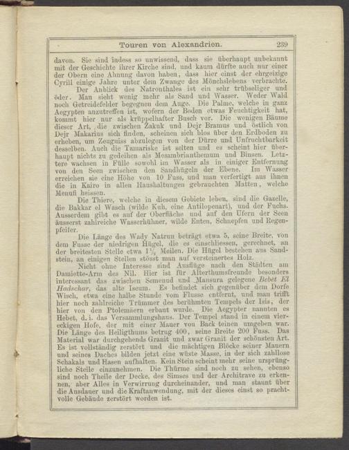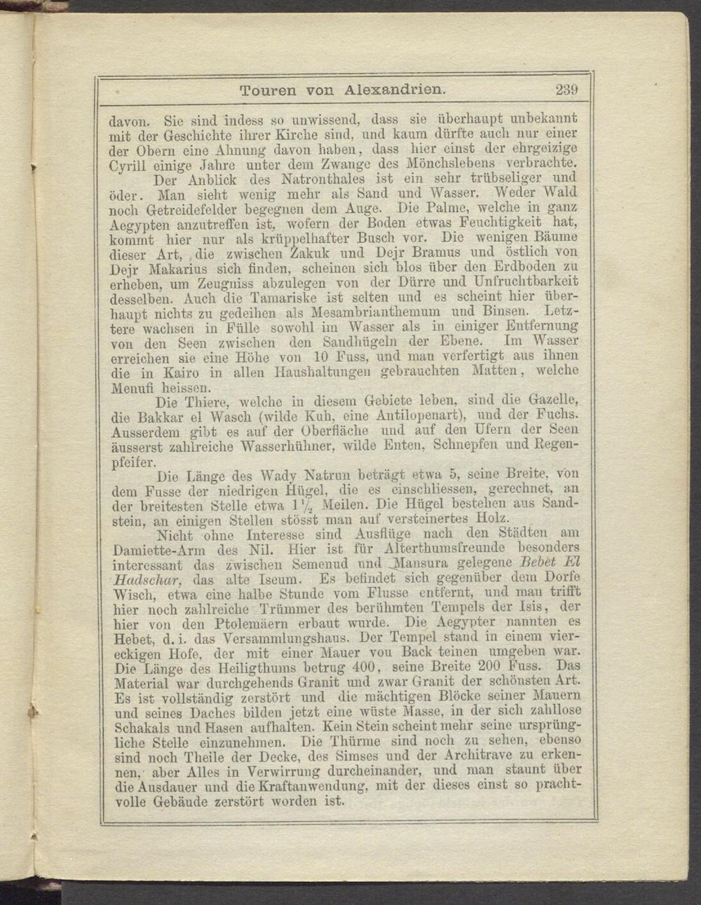 Der Anblick des Natronthaies ist ein sehr trübseliger und öder. Man sieht wenig mehr als Sand und Wasser. Weder Wald noch Getreidefelder begegnen dem Auge. Die Palme, welche in ganz Aegypten anzutreffen ist, wofern der Boden etwas Feuchtigkeit hat, kommt hier nur als krüppelhafter Busch vor. Die wenigen Bäume dieser Art, die zwischen Zakuk und Dejr Bramus und östlich von Dejr Makarius sich finden, scheinen sich blos über den Erdboden zu erheben, um Zeugniss abzulegen von der Dürre und Unfruchtbarkeit desselben. Auch die Tamariske ist selten und es scheint hier überhaupt nichts zu gedeihen als Mesambriaiithemum und Binsen. Letztere wachsen in Fülle sowohl im Wasser als in einiger Entfernung von den Seen zwischen den Sandhügeln der Ebene. Im Wasser erreichen sie eine Höhe von 10 Fuss, und man verfertigt aus ihnen die in Kairo in allen Haushaltungen gebrauchten Matten, welche Menufi heissen.