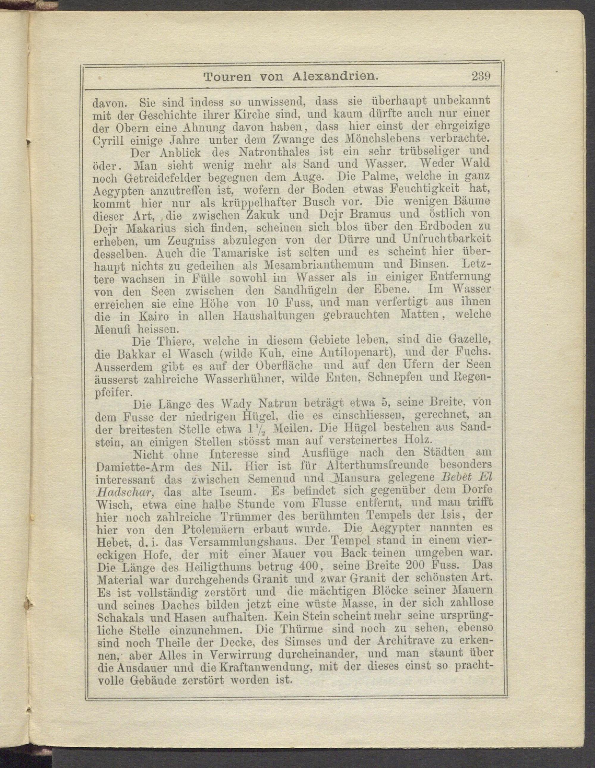 Nicht ohne Interesse sind Ausflüge nach den Städten am Damiette-Arm des Nil. Hier ist für Alterthumsfreunde besonders interessant das zwischen Semenud und .Mansura gelegene Bebet El Hadschar, das alte Iseum. Es befindet sich gegenüber dem Dorfe Wisch, etwa eine halbe Stunde vom Flusse entfernt, und man trifft hier noch zahlreiche Trümmer des berühmten Tempels der Isis, der hier von den Ptolemäern erbaut wurde. Die Aegyptcr nannten es Hebet, d. i. das Versammlungshaus. Der Tempel stand in einem viereckigen Hofe, der mit einer Mauer vou Back teinen umgeben war. Die Länge des Heiligthums betrug 400, seine Breite 200 Fuss. Das Material w r ar durchgehends Granit und zwar Granit der schönsten Art. Es ist vollständig zerstört und die mächtigen Blöcke seiner Mauern und seines Daches bilden jetzt eine wüste Masse, in der sich zahllose Schakals und Hasen aufhalten. Kein Stein scheint mehr seine ursprüngliche Stelle einzunehmen. Die Tlnirme sind noch zu sehen, ebenso sind noch Theile der Decke, des Simses und der Architrave zu erkennen, aber Alles in Verwirrung durcheinander, und man staunt über die Ausdauer und die Kraftanwendung, mit der dieses einst so prachtvolle Gebäude zerstört worden ist.