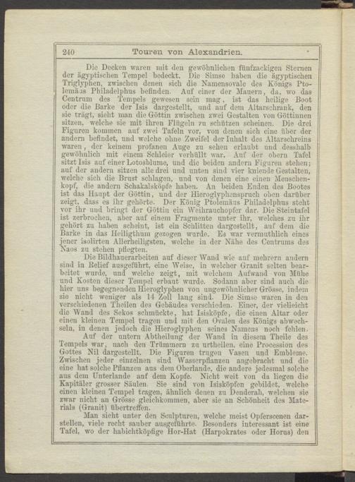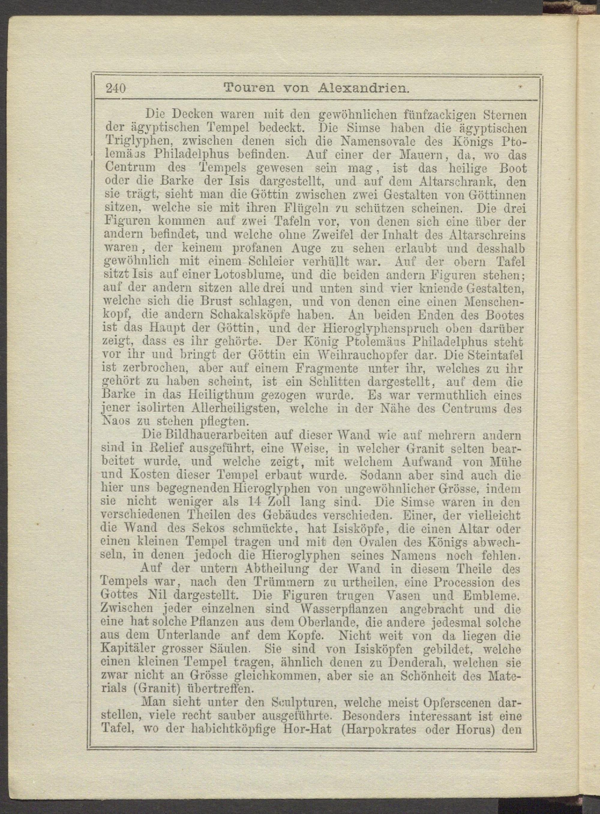 Die Docken waren mit den gewöhnlichen fünfzackigen Sternen der ägyptischen Tempel hcdeckt. Die Simse haben die ägyptischen Triglyphen, zwischen denen sich die Namensovale des Königs Pto- lcmäjs Philadelplius befinden. Auf einer der Mauern, da, wo das Centruin des Tempels gewesen sein mag, ist das heilige Boot oder die Barke der Isis dargestellt, und auf dem Altarschrank, den sie trägt, sieht man die Göttin zwischen zwei Gestalten von Göttinnen sitzen, welche sie mit ihren Flügeln zu schützen scheinen. Die drei Figuren kommen auf zwei Tafeln vor, von denen sich eine über der andern befindet, und welche ohne Zweifel der Inhalt des Altarschreins waren, der keinem profanen Auge zu sehen erlaubt und desshalb gewöhnlich mit einem Schleier verhüllt war. Auf der obern Tafel sitzt Isis auf einer Lotosblume, und die beiden andern Figuren stehen; auf der andern sitzen alle drei und unten sind vier kniende Gestalten, welche sich die Brust schlagen, und von denen eine einen Menschenkopf, die andern Schakalsköpfe haben. An beiden Enden des Bootes ist das Haupt der Göttin, und der Hieroglyphenspruch oben darüber zeigt, dass es ihr gehörte. Der König Ptolemäus Philadelplius steht vor ihr und bringt, der Göttin ein Weihrauchopfer dar. Die Steintafel ist zerbrochen, aber auf einem Fragmente unter ihr, welches zu ihr gehört zu haben scheint, ist ein Schlitten dargestellt, auf dem die Barke in das Heiligthum gezogen wurde. Es war vermuthlich eines jener isolirten Allerheiligsten, welche in der Nähe des Centrums des Naos zu stehen pflegten.