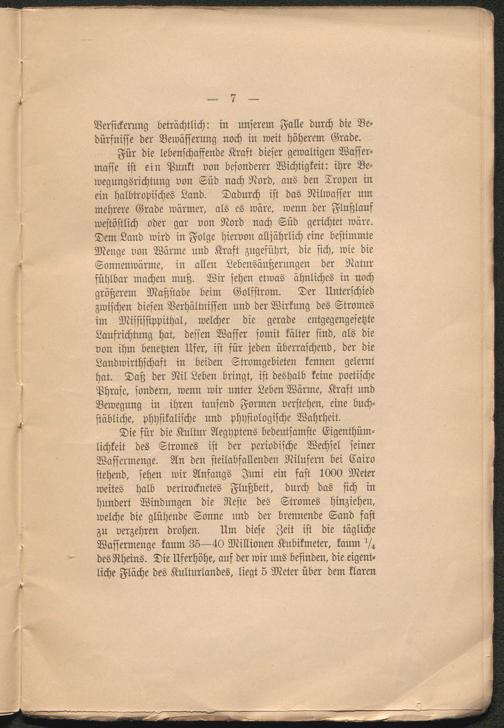Für die lebenschaffende Kraft dieser gewaltigen Wassermasse ist ein Punkt von besonderer Wichtigkeit: ihre Bewegungsrichtung von Süd nach Nord, aus den Tropen in ein halbtropisches Land. Dadurch ist das Nilwasser um mehrere Grade wärmer, als es wäre, wenn der Flußlauf westöstlich oder gar von Nord nach Süd gerichtet wäre. Dem Land wird in Folge hiervon alljährlich eine bestimmte Menge von Wärme und Kraft zugeführt, die sich, wie die Sonnenwärme, in allen Lebensäußerungen der Natur fühlbar machen muß. Wir sehen etwas ähnliches in noch größerem Maßstabe beim Golfstrom. Der Unterschied zwischen diesen Verhältnissen und der Wirkung des Stromes im Mississippithal, welcher die gerade entgegengesetzte Laufrichtung hat, dessen Wasser somit kälter sind, als die von ihm benetzten Ufer, ist für jeden überraschend, der die Landwirthschaft in beiden Stromgebieten kennen gelernt hat. Daß der Nil Leben bringt, ist deshalb keine poetische Phrase, sondern, wenn wir unter Leben Wärme, Kraft und Bewegung in ihren tausend Formen verstehen, eine buchstäbliche, physikalische und physiologische Wahrheit.