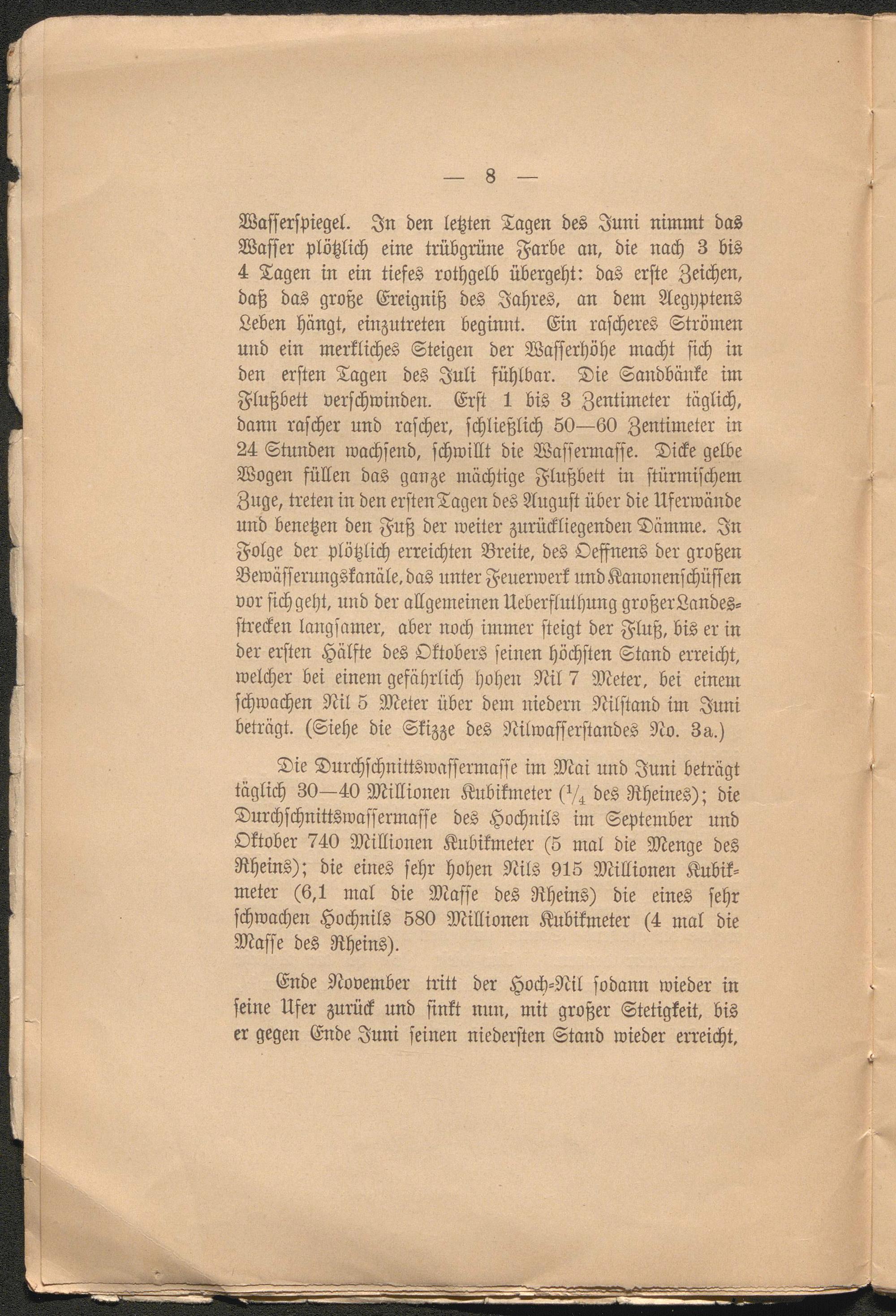 Die Durchschnittswassermasse im Mai und Juni beträgt täglich 30—40 Millionen Kubikmeter des Rheines); die Durchschnittswassermasse des Hochnils im September und Oktober 740 Millionen Kubikmeter (5 mal die Menge des Rheins); die eines sehr hohen Nils 915 Millionen Kubikmeter (6,1 mal die Masse des Rheins) die eines sehr schwachen Hochnils 580 Millionen Kubikmeter (4 mal die Masse des Rheins).