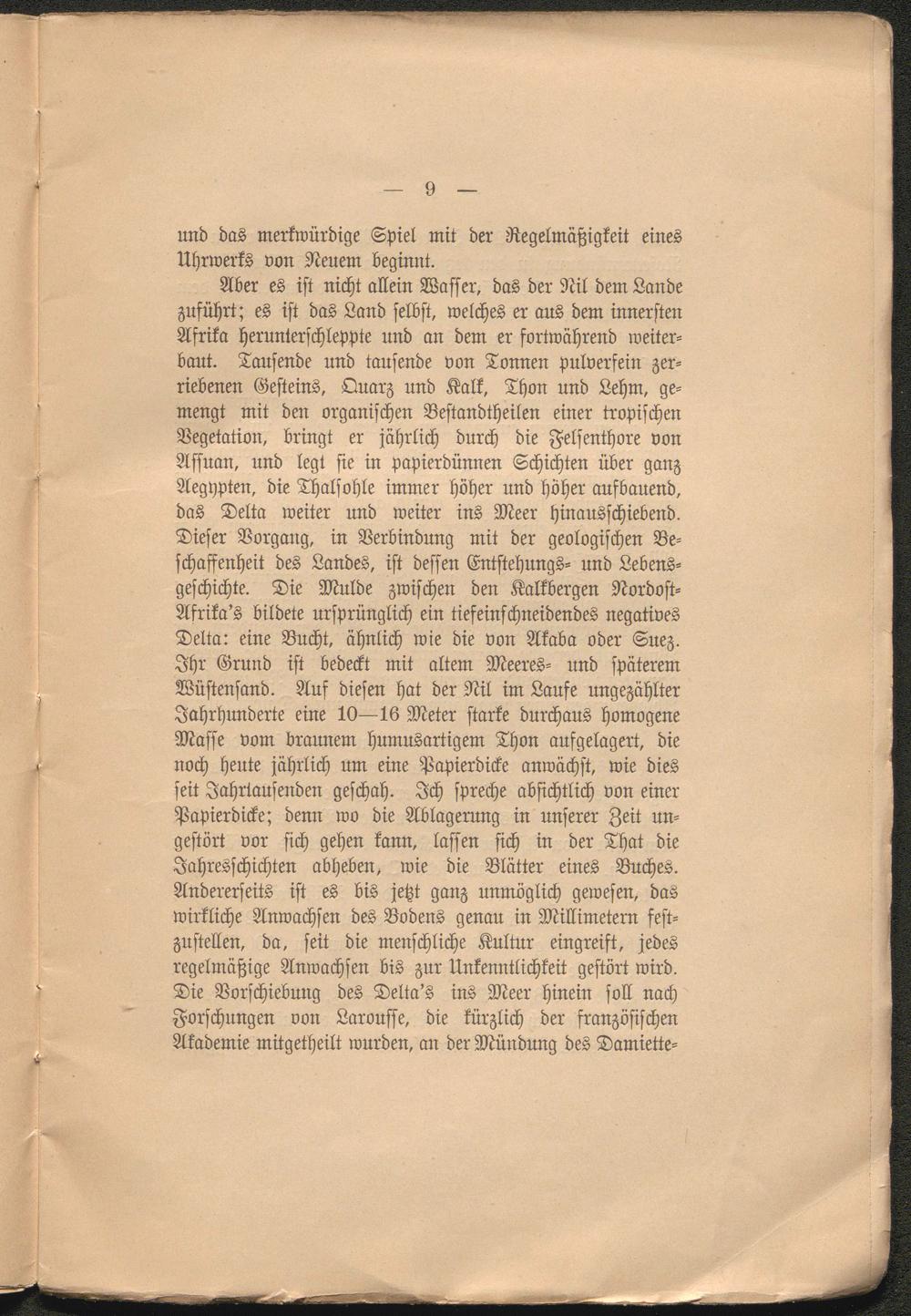 Aber es ist nicht allein Wasser, das der Nil dem Lande zuführt; es ist das Land selbst, welches er aus dem innersten Afrika herunterschleppte und an dem er fortwährend weiterbaut. Tausende und taufende von Tonnen pulverfein zerriebenen Gesteins, Quarz und Kalk, Thon und Lehm, gemengt mit den organischen Bestandtheilen einer tropischen Vegetation, bringt er jährlich durch die Felsenthore von Afsuan, und legt sie in papierdünnen Schichten über ganz Aegypten, die Thalsohle immer höher und höher aufbauend, das Delta weiter und weiter ins Meer hinausschiebend. Dieser Vorgang, in Verbindung mit der geologischen Beschaffenheit des Landes, ist dessen Entstehungs- und Lebensgeschichte. Die Mulde zwischen den Kalkbergen Nordost- Afrika's bildete ursprünglich ein tiefeinschneidendes negatives Delta: eine Bucht, ähnlich wie die von Akaba oder Suez. Ihr Grund ist bedeckt mit altem Meeres- und späterem Wüstensand. Auf diesen hat der Nil im Lause ungezählter Jahrhunderte eine 10—16 Meter starke durchaus homogene Masse vom braunem humusartigem Thon aufgelagert, die noch heute jährlich um eine Papierdicke anwächst, wie dies seit Jahrtausenden geschah. Ich spreche absichtlich von einer Papierdicke; denn wo die Ablagerung in unserer Zeit ungestört vor sich gehen kann, lassen sich in der That die Jahresschichten abheben, wie die Blätter eines Buches. Andererseits ist es bis jetzt ganz unmöglich gewesen, das wirkliche Anwachsen des Bodens genau in Millimetern festzustellen, da, seit die menschliche Kultur eingreift, jedes regelmäßige Anwachsen bis zur Unkenntlichkeit gestört wird. Die Vorschiebung des Delta's ins Meer hinein soll nach Forschungen von Larousse, die kürzlich der französischen Akademie mitgetheilt wurden, an der Mündung des Damiette-