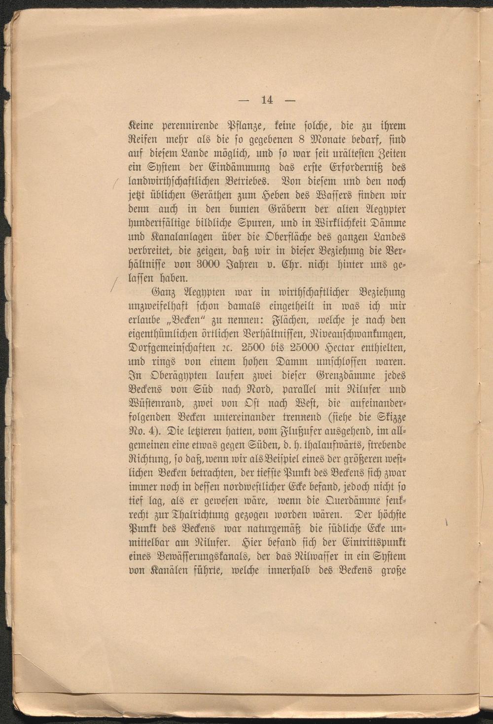' Ganz Aegypten war in wirtschaftlicher Beziehung unzweifelhaft schon damals eingetheilt in was ich mir erlaube „Becken" zu nennen: Flächen, welche je nach den eigenthümlichen örtlichen Verhältnissen, Niveauschwankungen, Dorfgemeinschaften rc. 2500 bis 25000 Hectar enthielten, und rings von einem hohen Damm umschlossen waren. In Oberägypten laufen zwei dieser Grenzdämme jedes Beckens von Süd nach Nord, parallel mit Nilufer und Wüstenrand, zwei von Ost nach West, die aufeinanderfolgenden Becken untereinander trennend (siehe die Skizze No. 4). Die letzteren hatten, vom Flußufer ausgehend, im allgemeinen eine etwas gegen Süden, d. h. thalaufwärts, strebende Richtung, so daß, wenn wir als Beispiel eines der größeren westlichen Becken betrachten, der tiefste Punkt des Beckens sich zwar immer noch in dessen nordwestlicher Ecke befand, jedoch nicht so tief lag, als er gewesen wäre, wenn die Querdämme senkrecht zur Thalrichtung gezogen worden wären. Der höchste Punkt des Beckens war naturgemäß die südliche Ecke unmittelbar am Nilufer. Hier befand sich der Eintrittspunkt eines Bewässerungskanals, der das Nilwaffer in ein System von Kanälen führte, welche innerhalb des Beckens große
