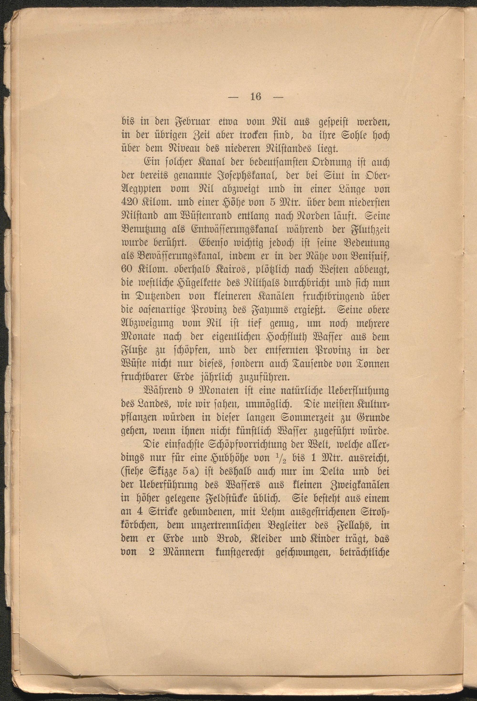 Ein solcher Kanal der bedeutsamsten Ordnung ist auch der bereits genannte Josephskanal, der bei Siut in Ober- Aegypten vom Nil abzweigt und in einer Länge von 420 Kilom. und einer Höhe von 5 Mir. über dem niedersten Nilstand am Wüstenrand entlang nach Norden laust. Seine Benutzung als Entwässerungskanal während der Fluthzeit wurde berührt. Ebenso wichtig jedoch ist seine Bedeutung als Bewässerungskanal, indem er in der Nähe von Benisuif, 60 Kilom. oberhalb Kairos, plötzlich nach Westen abbeugt, die westliche Hügelkette des Nilthals durchbricht und sich nun in Dutzenden von kleineren Kanälen fruchtbringend über die oasenartige Provinz des Fayums ergießt. Seine obere Abzweigung vom Nil ist tief genug, um noch mehrere Monate nach der eigentlichen Hochfluth Wasser aus dem Fluße zu schöpfen, und der entfernten Provinz in der Wüste nicht nur dieses, sondern auch Tausende von Tonnen fruchtbarer Erde jährlich zuzuführen.