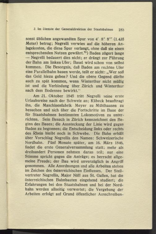 Baden zu begonnen; die Entscheidung links oder rechts des Rhein bleibt noch in Schwebe. Die Bahn erhält über Vorschlag Negrellis den Namen: Schweizerische Nordbahn. Fünf Monate später, am 16. März 1846, findet die erste Generalversammlung statt; mehr als dreihundert Personen nehmen daran teil; nur eine Stimme spricht gegen die Anträge; es herrscht allgemeine Freude; der Bau wird unverzüglich in Angriff genommen. Alle Anordnungen und alle Arbeiten stehen im Zeichen des österreichischen Einflusses. Der Stellvertreter Negrellis, Major Näff aus St. Gallen, hat die österreichischen Bahnbauten eingehend studiert; die Erfahrungen bei den Staatsbahnen und bei der Nordbahn werden allseitig verwertet; die Vergebung der Arbeiten erfolgt auf Grund öffentlicher Ausschreibun-