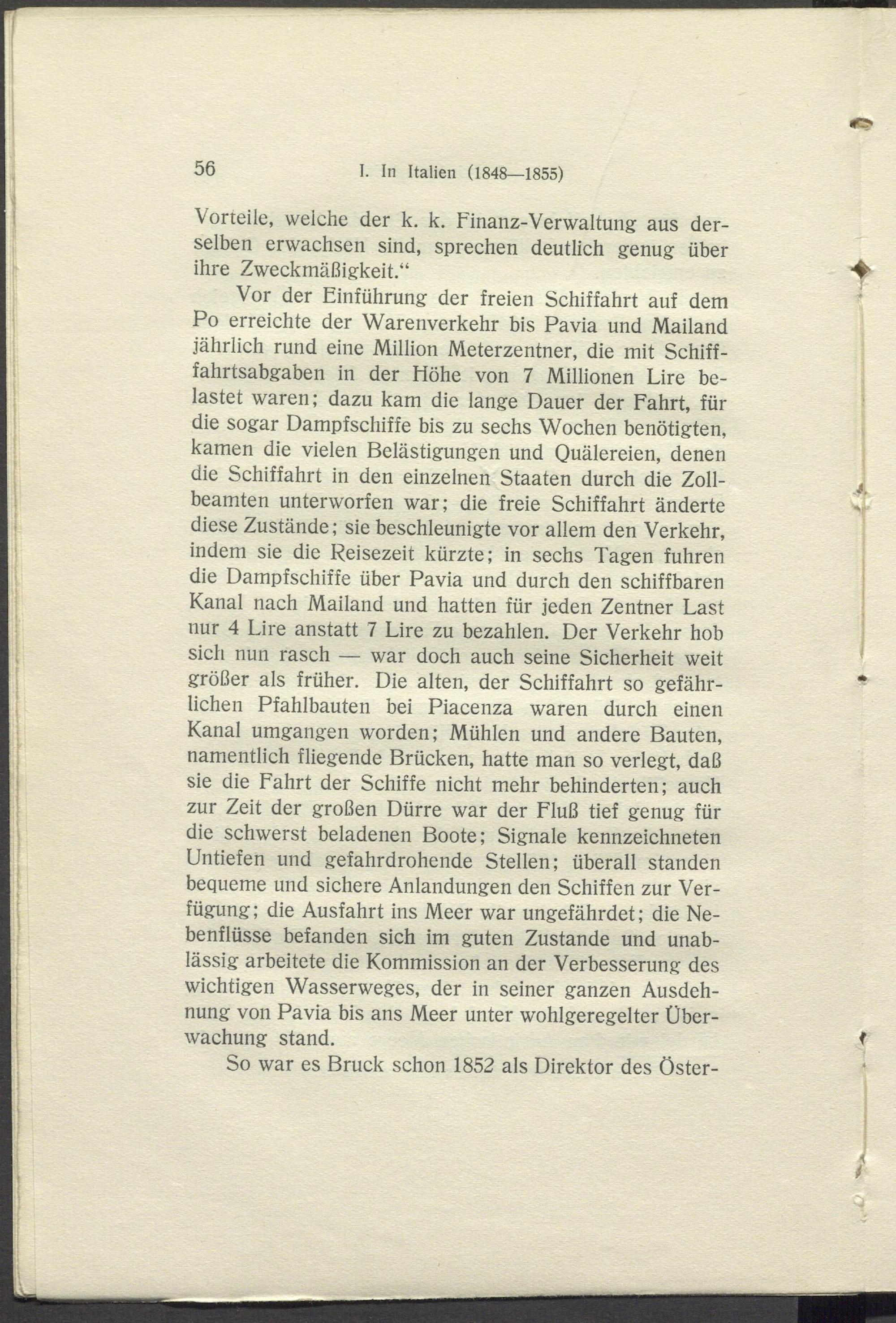 Vor der Einführung der freien Schiffahrt auf dem Po erreichte der Warenverkehr bis Pavia und Mailand jährlich rund eine Million Meterzentner, die mit Schifffahrtsabgaben in der Höhe von 7 Millionen Lire belastet waren; dazu kam die lange Dauer der Fahrt, für die sogar Dampfschiffe bis zu sechs Wochen benötigten, kamen die vielen Belästigungen und Quälereien, denen die Schiffahrt in den einzelnen Staaten durch die Zollbeamten unterworfen war; die freie Schiffahrt änderte diese Zustände; sie beschleunigte vor allem den Verkehr, indem sie die Reisezeit kürzte; in sechs Tagen fuhren die Dampfschiffe über Pavia und durch den schiffbaren Kanal nach Mailand und hatten für jeden Zentner Last nur 4 Lire anstatt 7 Lire zu bezahlen. Der Verkehr hob sich nun rasch — war doch auch seine Sicherheit weit größer als früher. Die alten, der Schiffahrt so gefährlichen Pfahlbauten bei Piacenza waren durch einen Kanal umgangen worden; Mühlen und andere Bauten, namentlich fliegende Brücken, hatte man so verlegt, daß sie die Fahrt der Schiffe nicht mehr behinderten; auch zur Zeit der großen Dürre war der Fluß tief genug für die schwerst beladenen Boote; Signale kennzeichneten Untiefen und gefahrdrohende Stellen; überall standen bequeme und sichere Anlandungen den Schiffen zur Verfügung; die Ausfahrt ins Meer war ungefährdet; die Nebenflüsse befanden sich im guten Zustande und unablässig arbeitete die Kommission an der Verbesserung des wichtigen Wasserweges, der in seiner ganzen Ausdehnung von Pavia bis ans Meer unter wohlgeregelter Überwachung stand.