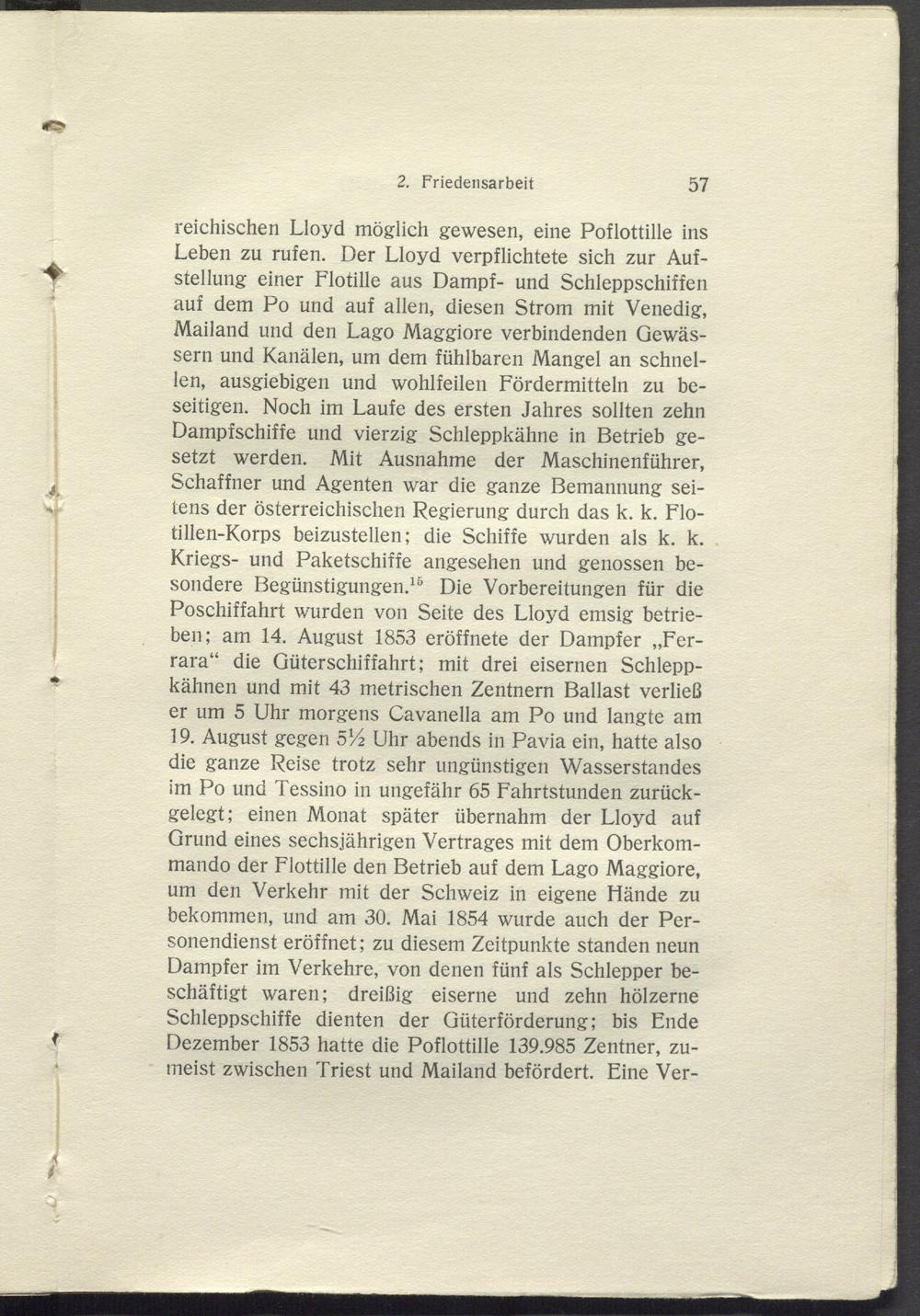 reichischen Lloyd möglich gewesen, eine Poflottille ins Leben zu rufen. Der Lloyd verpflichtete sich zur Aufstellung einer Flotille aus Dampf- und Schleppschiffen auf dem Po und auf allen, diesen Strom mit Venedig, Mailand und den Lago Maggiore verbindenden Gewässern und Kanälen, um dem fühlbaren Mangel an schnellen, ausgiebigen und wohlfeilen Fördermitteln zu beseitigen. Noch im Laufe des ersten Jahres sollten zehn Dampfschiffe und vierzig Schleppkähne in Betrieb gesetzt werden. Mit Ausnahme der Maschinenführer, Schaffner und Agenten war die ganze Bemannung seitens der österreichischen Regierung durch das k. k. Flo- tillen-Korps beizustellen; die Schiffe wurden als k. k. Kriegs- und Paketschiffe angesehen und genossen besondere Begünstigungen. 15 Die Vorbereitungen für die Poschiffahrt wurden von Seite des Lloyd emsig betrieben; am 14. August 1853 eröffnete der Dampfer „Ferrara“ die Güterschiffahrt; mit drei eisernen Schleppkähnen und mit 43 metrischen Zentnern Ballast verließ er um 5 Uhr morgens Cavanella am Po und langte am 19. August gegen 0 V 2 Uhr abends in Pavia ein, hatte also die ganze Reise trotz sehr ungünstigen Wasserstandes im Po und Tessino in ungefähr 65 Fahrtstunden zurückgelegt; einen Monat später übernahm der Lloyd auf Grund eines sechsjährigen Vertrages mit dem Oberkommando der Flottille den Betrieb auf dem Lago Maggiore, um den Verkehr mit der Schweiz in eigene Hände zu bekommen, und am 30. Mai 1854 wurde auch der Personendienst eröffnet; zu diesem Zeitpunkte standen neun Dampfer im Verkehre, von denen fünf als Schlepper beschäftigt waren; dreißig eiserne und zehn hölzerne Schleppschiffe dienten der Güterförderung; bis Ende Dezember 1853 hatte die Poflottille 139.985 Zentner, zumeist zwischen Triest und Mailand befördert. Eine Ver-