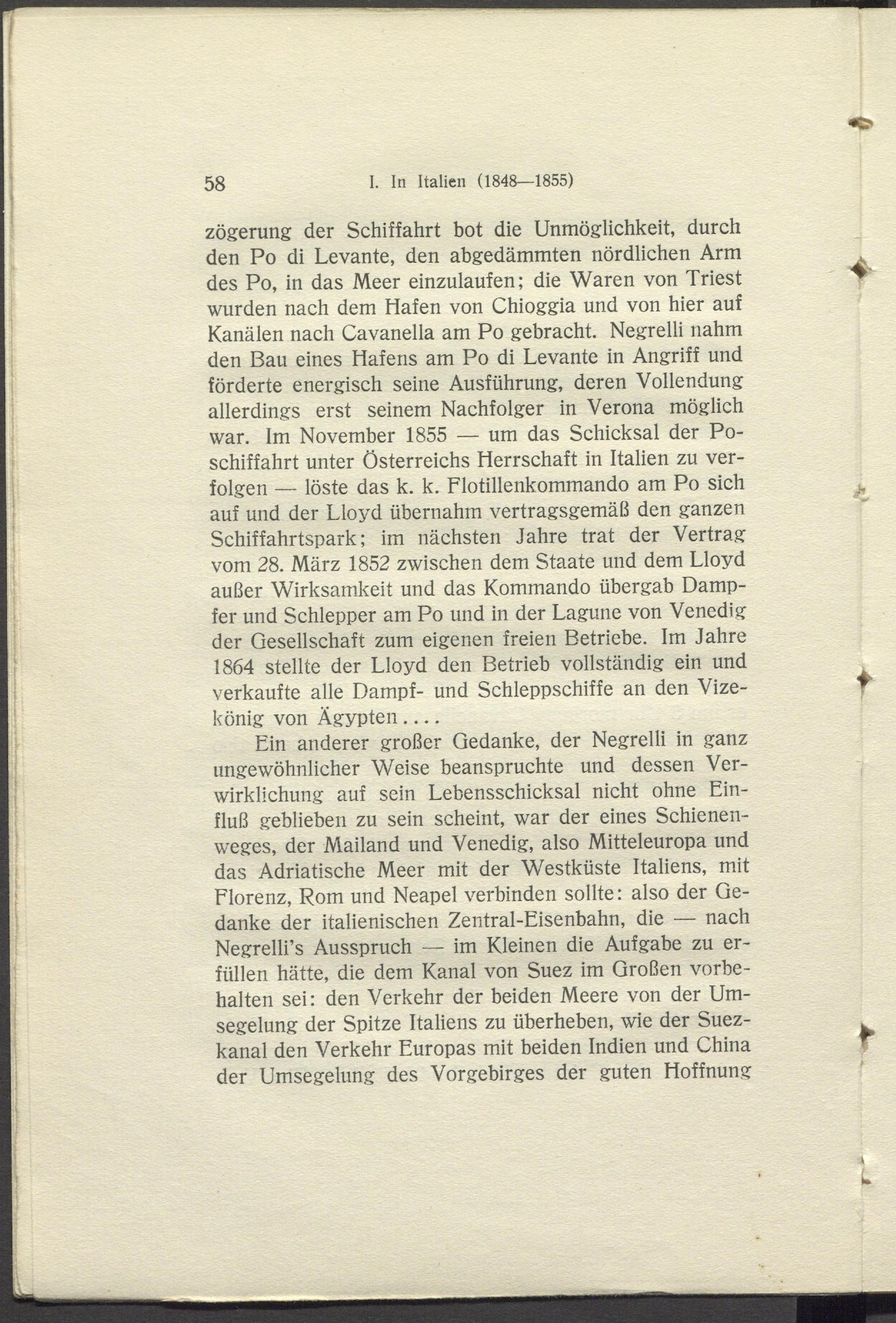Ein anderer großer Gedanke, der Negrelli in ganz ungewöhnlicher Weise beanspruchte und dessen Verwirklichung auf sein Lebensschicksal nicht ohne Einfluß geblieben zu sein scheint, war der eines Schienenweges, der Mailand und Venedig, also Mitteleuropa und das Adriatische Meer mit der Westküste Italiens, mit Florenz, Rom und Neapel verbinden sollte: also der Gedanke der italienischen Zentral-Eisenbahn, die — nach Negrelli’s Ausspruch — im Kleinen die Aufgabe zu erfüllen hätte, die dem Kanal von Suez im Großen Vorbehalten sei: den Verkehr der beiden Meere von der Um- segelung der Spitze Italiens zu überheben, wie der Suezkanal den Verkehr Europas mit beiden Indien und China der Umsegelung des Vorgebirges der guten Hoffnung
