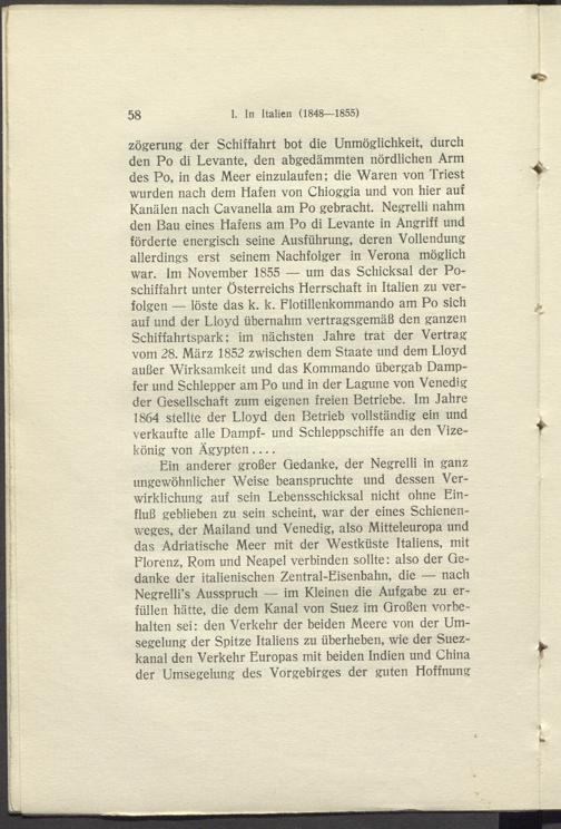 zögerung der Schiffahrt bot die Unmöglichkeit, durch den Po di Levante, den abgedämmten nördlichen Arm des Po, in das Meer einzulaufen; die Waren von Triest wurden nach dem Hafen von Chioggia und von hier auf Kanälen nach Cavanella am Po gebracht. Negrelli nahm den Bau eines Hafens am Po di Levante in Angriff und förderte energisch seine Ausführung, deren Vollendung allerdings erst seinem Nachfolger in Verona möglich war. Im November 1855 — um das Schicksal der Po- schiffahrt unter Österreichs Herrschaft in Italien zu verfolgen — löste das k. k. Flotillenkommando am Po sich auf und der Lloyd übernahm vertragsgemäß den ganzen Schiffahrtspark; im nächsten Jahre trat der Vertrag vom 28. März 1852 zwischen dem Staate und dem Lloyd außer Wirksamkeit und das Kommando übergab Dampfer und Schlepper am Po und in der Lagune von Venedig der Gesellschaft zum eigenen freien Betriebe. Im Jahre 1864 stellte der Lloyd den Betrieb vollständig ein und verkaufte alle Dampf- und Schleppschiffe an den Vizekönig von Ägypten_