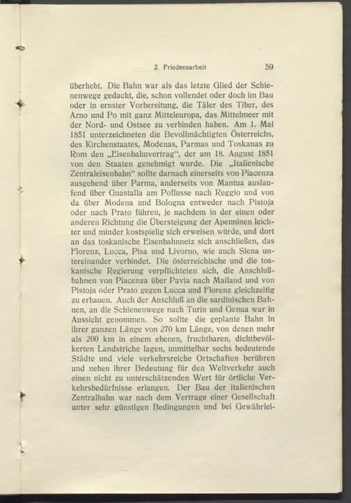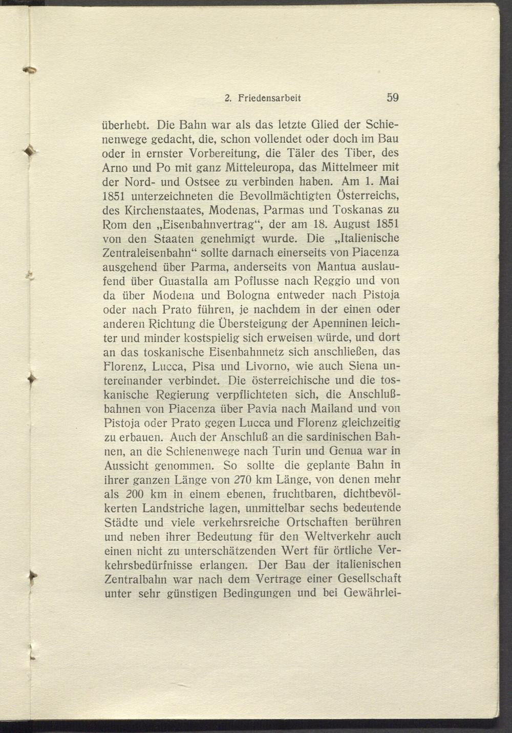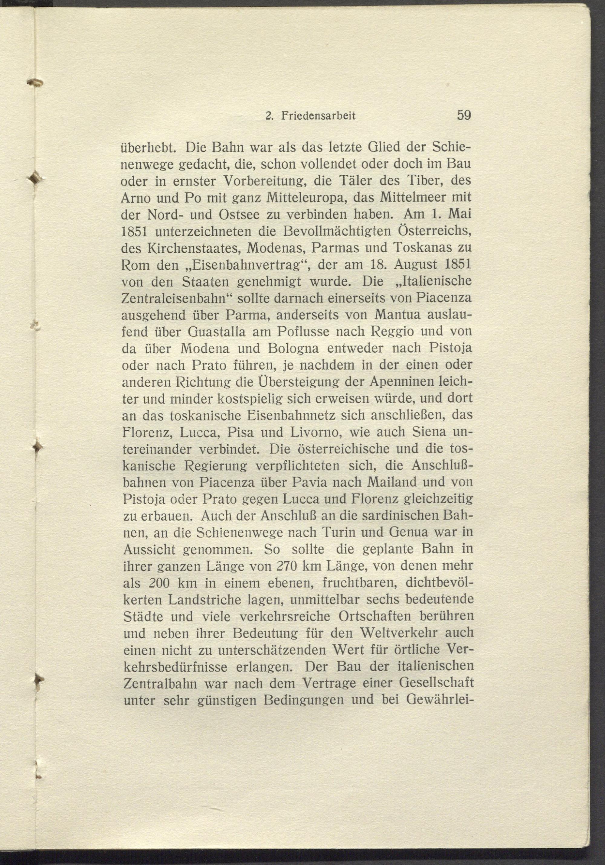 überhebt. Die Bahn war als das letzte Glied der Schienenwege gedacht, die, schon vollendet oder doch im Bau oder in ernster Vorbereitung, die Täler des Tiber, des Arno und Po mit ganz Mitteleuropa, das Mittelmeer mit der Nord- und Ostsee zu verbinden haben. Am 1. Mai 1851 Unterzeichneten die Bevollmächtigten Österreichs, des Kirchenstaates, Modenas, Parmas und Toskanas zu Rom den „Eisenbahnvertrag“, der am 18. August 1851 von den Staaten genehmigt wurde. Die „Italienische Zentraleisenbahn“ sollte darnach einerseits von Piacenza ausgehend über Parma, anderseits von Mantua auslaufend über Guastalla am Poflusse nach Reggio und von da über Modena und Bologna entweder nach Pistoja oder nach Prato führen, je nachdem in der einen oder anderen Richtung die Ubersteigung der Apenninen leichter und minder kostspielig sich erweisen würde, und dort an das toskanische Eisenbahnnetz sich anschließen, das Florenz, Lucca, Pisa und Livorno, wie auch Siena untereinander verbindet. Die österreichische und die toskanische Regierung verpflichteten sich, die Anschlußbahnen von Piacenza über Pavia nach Mailand und von Pistoja oder Prato gegen Lucca und Florenz gleichzeitig zu erbauen. Auch der Anschluß an die sardinischen Bahnen, an die Schienenwege nach Turin und Genua war in Aussicht genommen. So sollte die geplante Bahn in ihrer ganzen Länge von 270 km Länge, von denen mehr als 200 km in einem ebenen, fruchtbaren, dichtbevölkerten Landstriche lagen, unmittelbar sechs bedeutende Städte und viele verkehrsreiche Ortschaften berühren und neben ihrer Bedeutung für den Weltverkehr auch einen nicht zu unterschätzenden Wert für örtliche Verkehrsbedürfnisse erlangen. Der Bau der italienischen Zentralbahn w r ar nach dem Vertrage einer Gesellschaft unter sehr günstigen Bedingungen und bei Gewährlei-