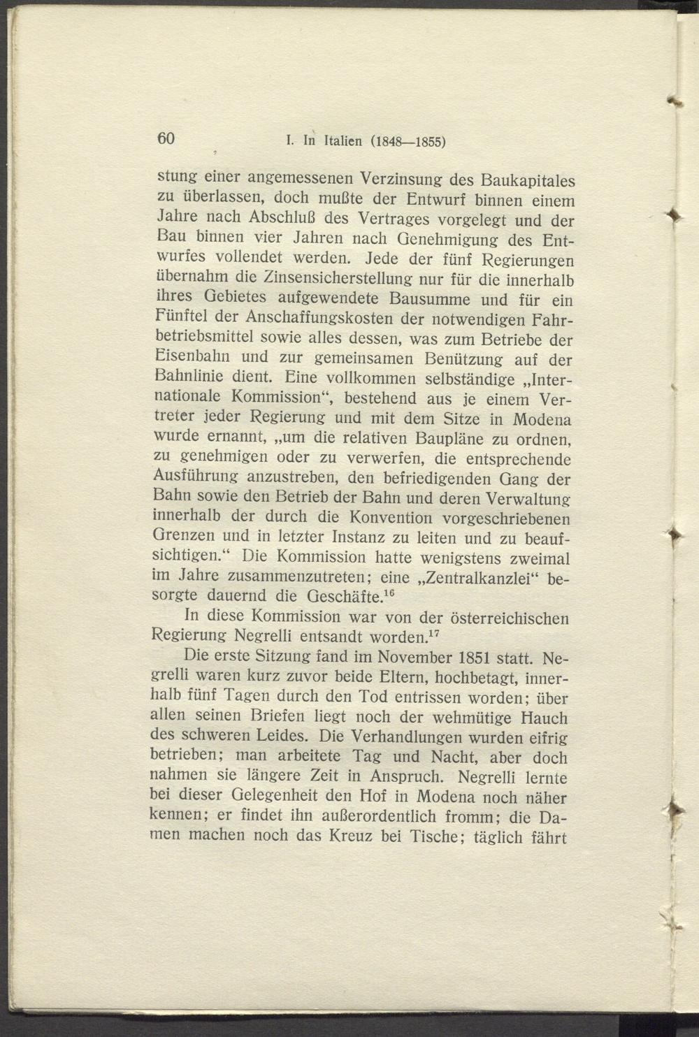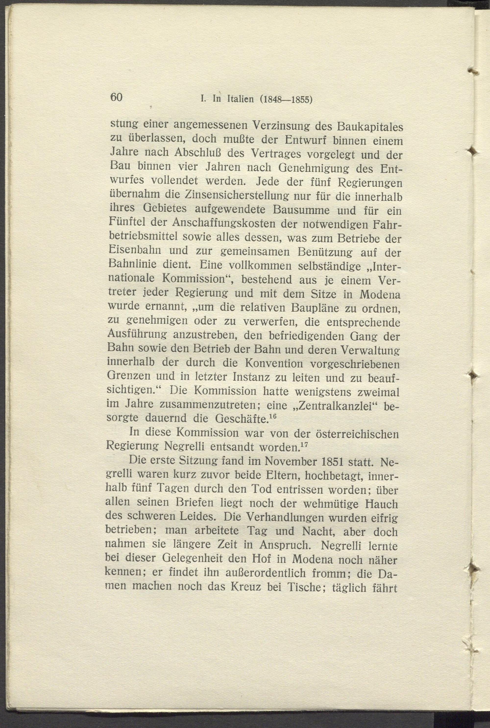 stung einer angemessenen Verzinsung des Baukapitales zu überlassen, doch mußte der Entwurf binnen einem Jahre nach Abschluß des Vertrages vorgelegt und der Bau binnen vier Jahren nach Genehmigung des Entwurfes vollendet werden. Jede der fünf Regierungen übernahm die Zinsensicherstellung nur für die innerhalb ihres Gebietes aufgewendete Bausumme und für ein Fünftel der Anschaffungskosten der notwendigen Fahrbetriebsmittel sowie alles dessen, was zum Betriebe der Eisenbahn und zur gemeinsamen Benützung auf der Bahnlinie dient. Eine vollkommen selbständige „Internationale Kommission“, bestehend aus je einem Vertreter jeder Regierung und mit dem Sitze in Modena wurde ernannt, „um die relativen Baupläne zu ordnen, zu genehmigen oder zu verwerfen, die entsprechende Ausführung anzustreben, den befriedigenden Gang der Bahn sowie den Betrieb der Bahn und deren Verwaltung innerhalb der durch die Konvention vorgeschriebenen Grenzen und in letzter Instanz zu leiten und zu beaufsichtigen.“ Die Kommission hatte wenigstens zweimal im Jahre zusammenzutreten; eine „Zentralkanzlei“ besorgte dauernd die Geschäfte. 16