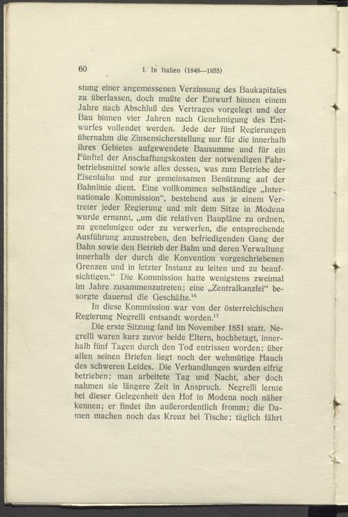 Die erste Sitzung fand im November 1851 statt. Negrelli waren kurz zuvor beide Eltern, hochbetagt, innerhalb fünf Tagen durch den Tod entrissen worden; über allen seinen Briefen liegt noch der wehmütige Hauch des schweren Leides. Die Verhandlungen wurden eifrig betrieben; man arbeitete Tag und Nacht, aber doch nahmen sie längere Zeit in Anspruch. Negrelli lernte bei dieser Gelegenheit den Hof in Modena noch näher kennen; er findet ihn außerordentlich fromm; die Damen machen noch das Kreuz bei Tische; täglich fährt