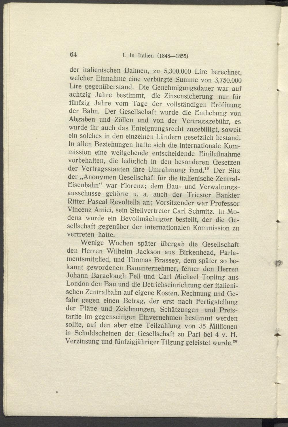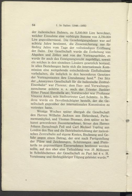 Wenige Wochen später übergab die Gesellschaft den Herren Wilhelm Jackson aus Birkenhead, Parlamentsmitglied, und Thomas Brassey, dem später so bekannt gewordenen Bauunternehmer, ferner den Herren Johann Baraclough Fell und Carl Michael Topling aus London den Bau und die Betriebseinrichtung der italienischen Zentralbahn auf eigene Kosten, Rechnung und Gefahr gegen einen Betrag, der erst nach Fertigstellung der Pläne und Zeichnungen, Schätzungen und Preistarife im gegenseitigen Einvernehmen bestimmt werden sollte, auf den aber eine Teilzahlung von 35 Millionen in Schuldscheinen der Gesellschaft zu Pari bei 4 v. H. Verzinsung und fünfzigjähriger Tilgung geleistet wurde. 2 *