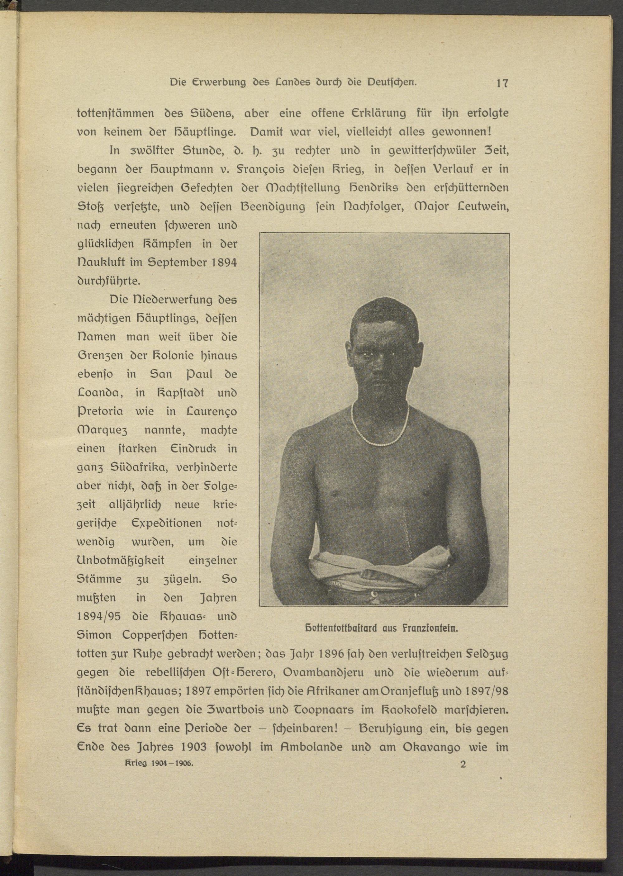 In zwölfter Stunde, d. h. zu rechter und in gewitterschwüler Zeit, begann der löauptmann v. §ran^ois diesen I^rieg, in dessen Verlauf er in vielen siegreichen Gefechten der Machtstellung lösndriks den erschütternden Stoß versetzte, und dessen Gsendigung sein Nachfolger, Major Leutwein, nach erneuten schweren und glücklichen dämpfen in der Nauklukt im September 1894 durchführte.