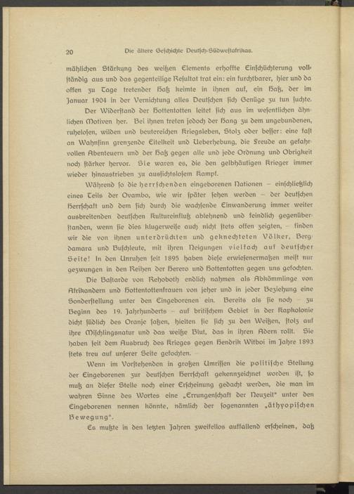 mählichen Stärkung des weißen Elements erhoffte Einschüchterung vollständig aus und dos gegenteilige Resultat trat ein: ein furchtbarer, hier und da offen zu Eage tretender Saß keimte in ihnen auf, ein Saß, der >m Januar ly04 in der Vernichtung alles Deutschen sich (Zenügs zu tun suchte.