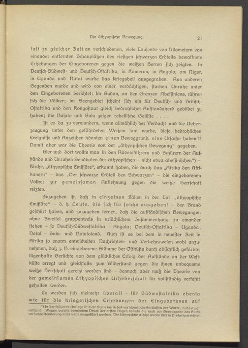 Gier und dort wollte man in den Rädelsführern und Schürern der Auk- stände und Unruhen Sendboten der äthiopischen nicht etwa abessinischen*) - Kirche, „äthiopische Emissärs", erkannt haben, die durch das „Afrika den Afrikanern" — das „Der schwarze Erdteil den Schwarzen" — die eingeborenen Völker zur gemeinsamen Auflehnung gegen die weiße Gerrschakt reizten.